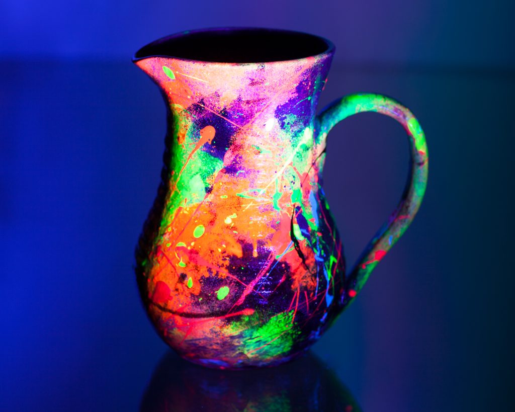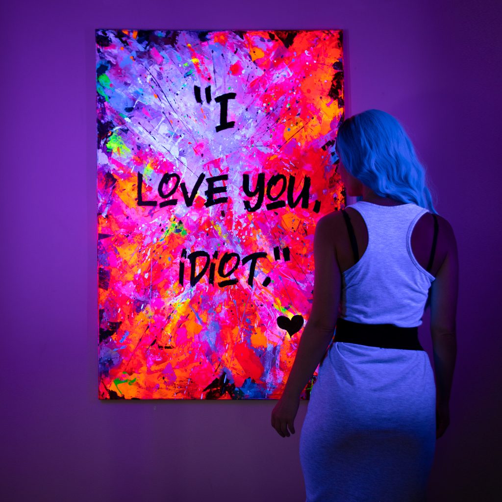Meaning that by day you see a normal painting, and if the room goes dark, and UV light is on, the painting it becomes more glowing, shining, coloured, vibrant and spectacular.