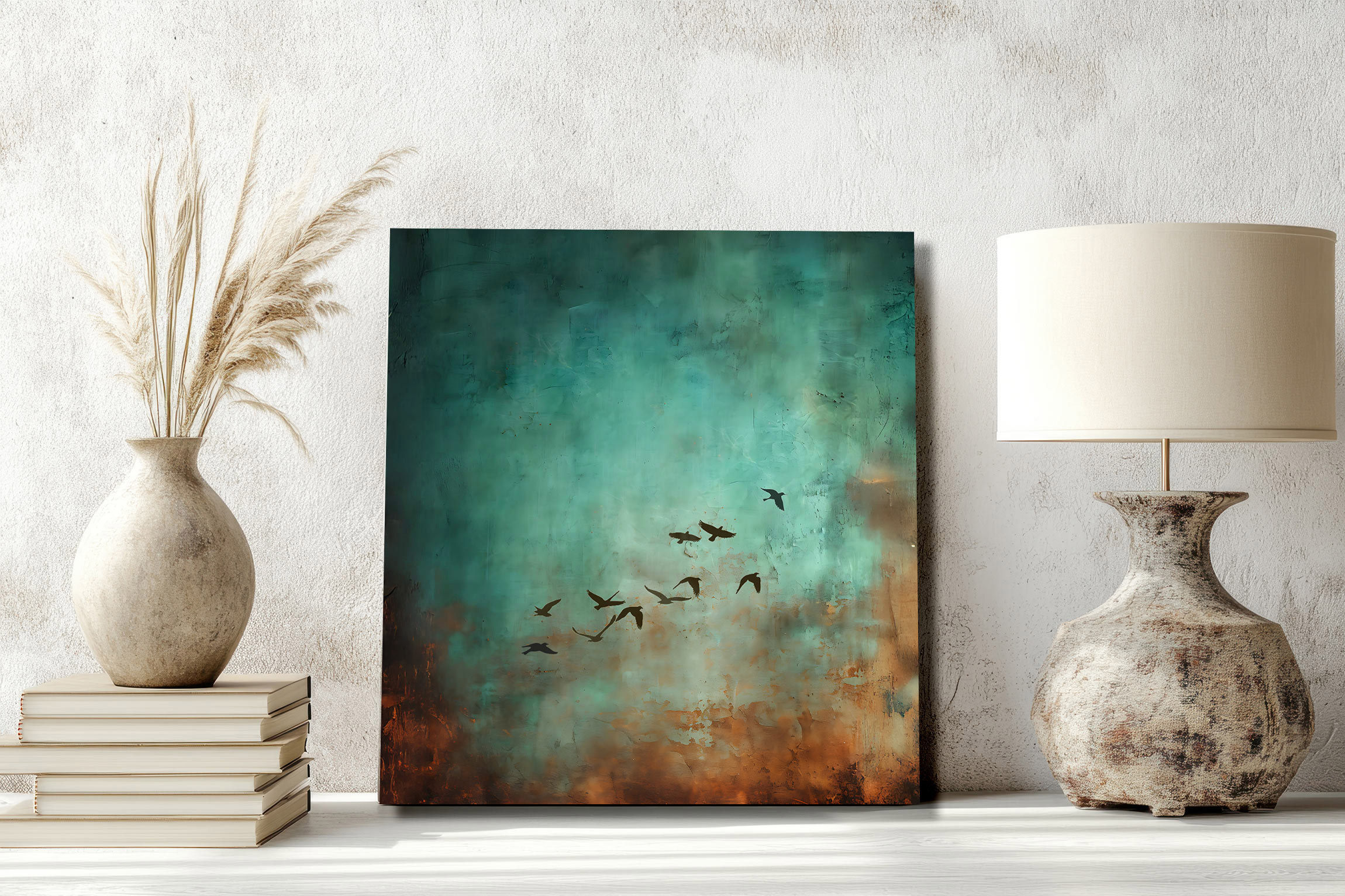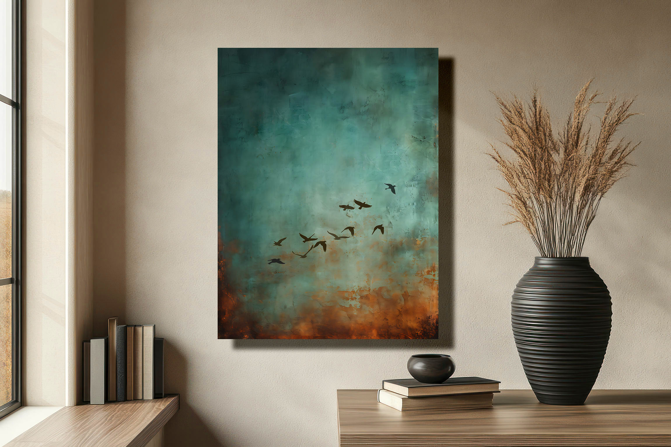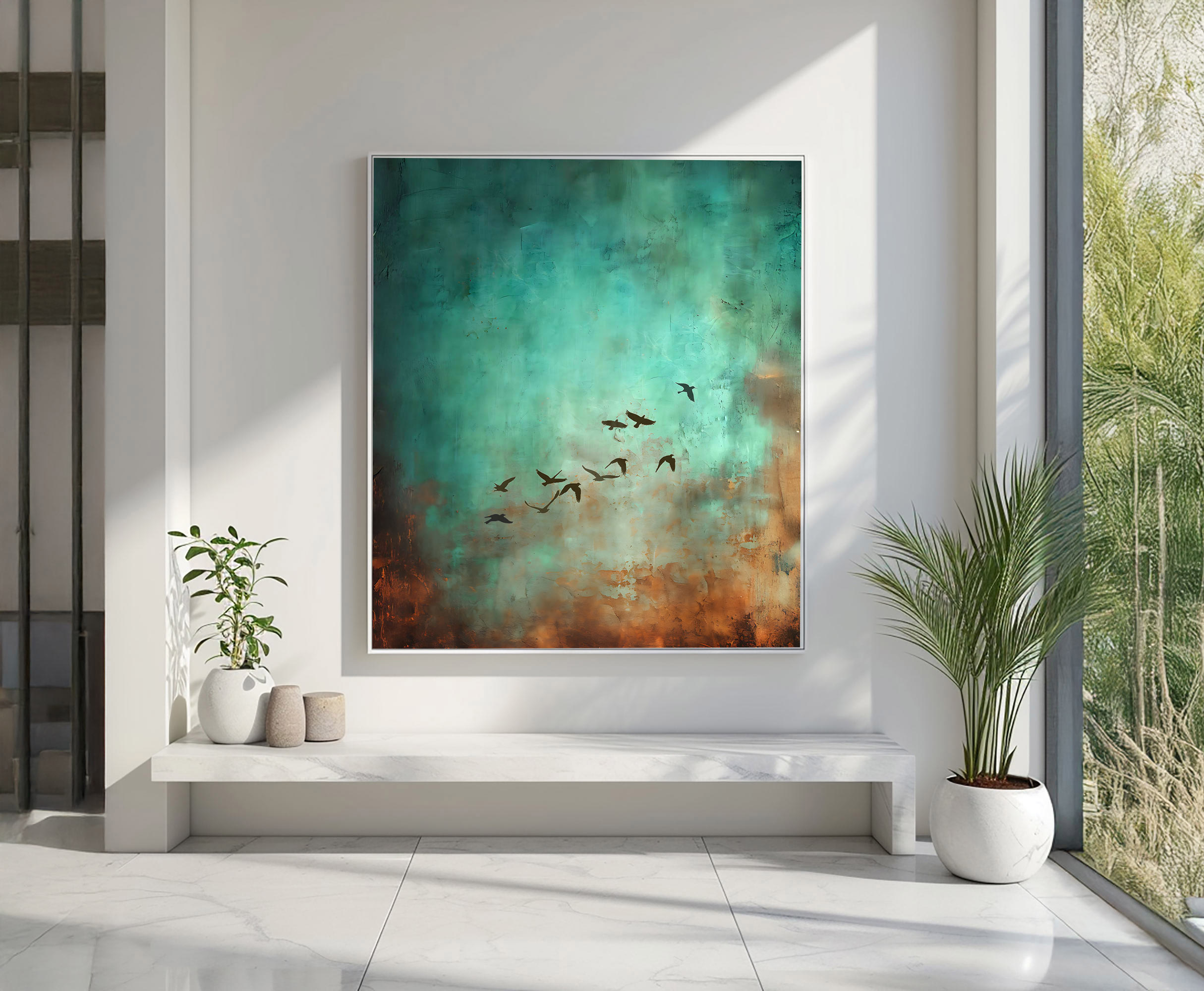 The green-turquoise background evokes open sky and vast natural space, while the bronze and warm accents ground the scene. The birds flying across the expanse symbolize escape, hope, collective energy and the beauty of nature in motion. Rendered in a modern abstract style, this artwork fits perfectly in contemporary, minimalist, Scandinavian or luxury interiors.