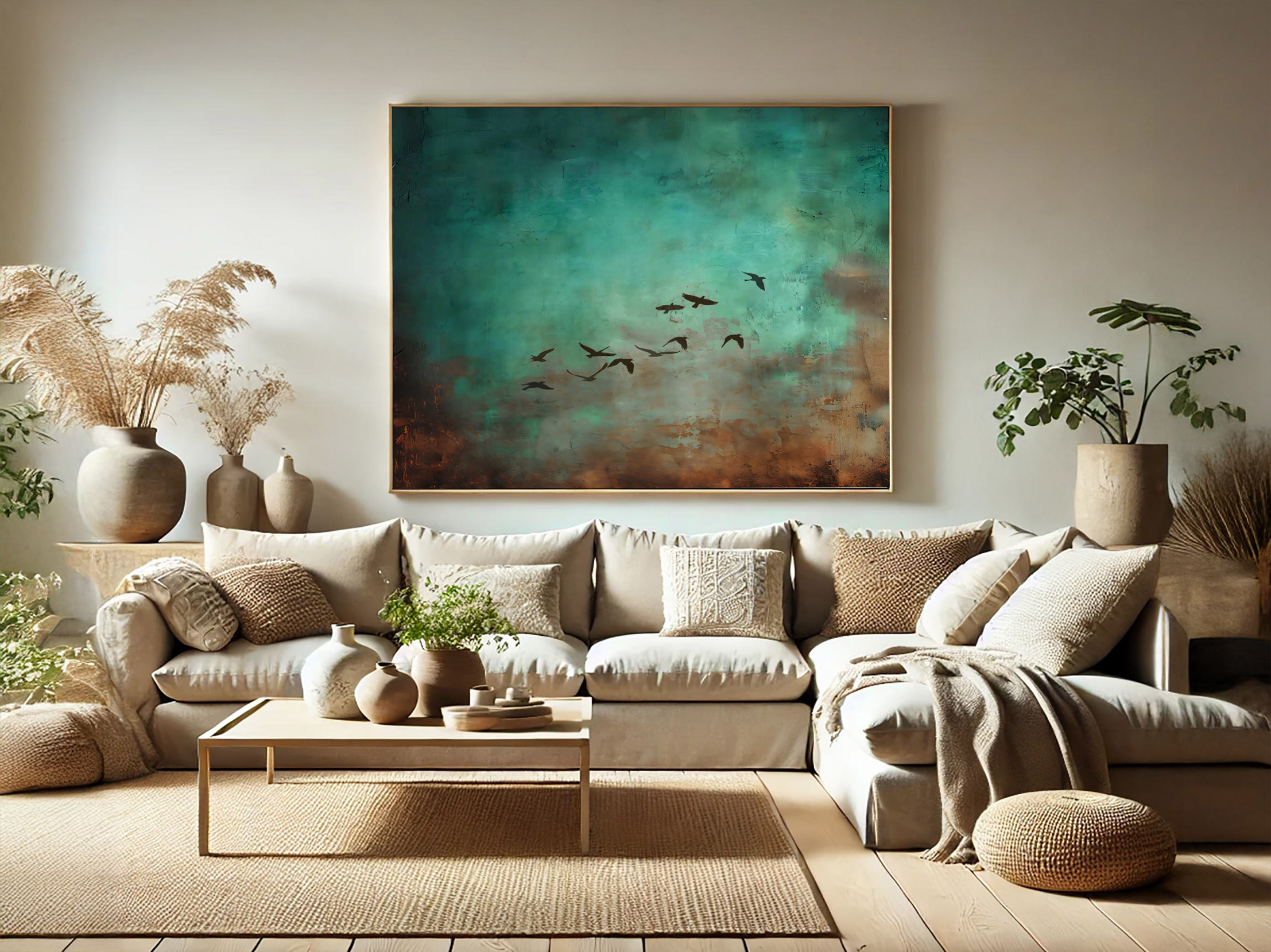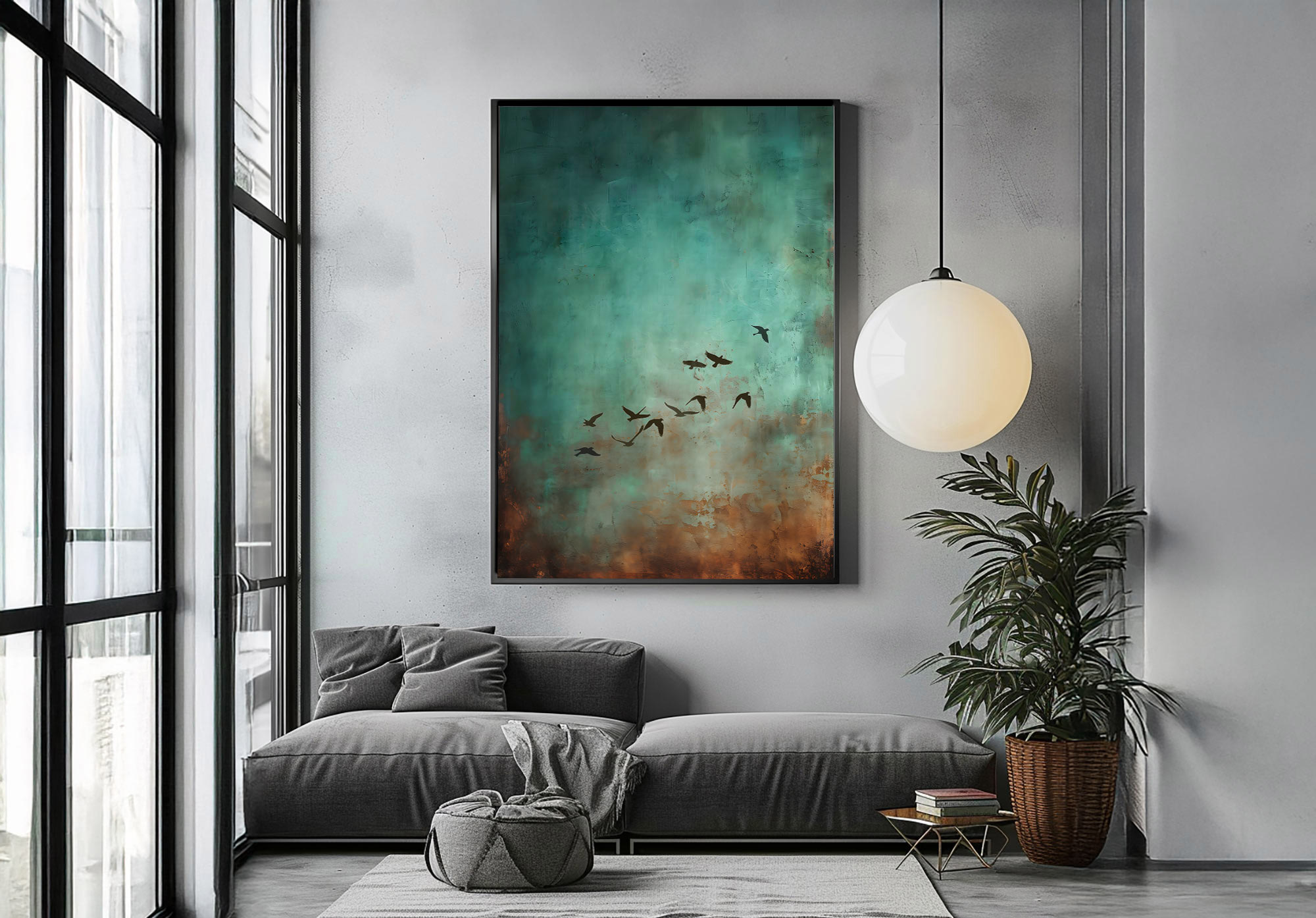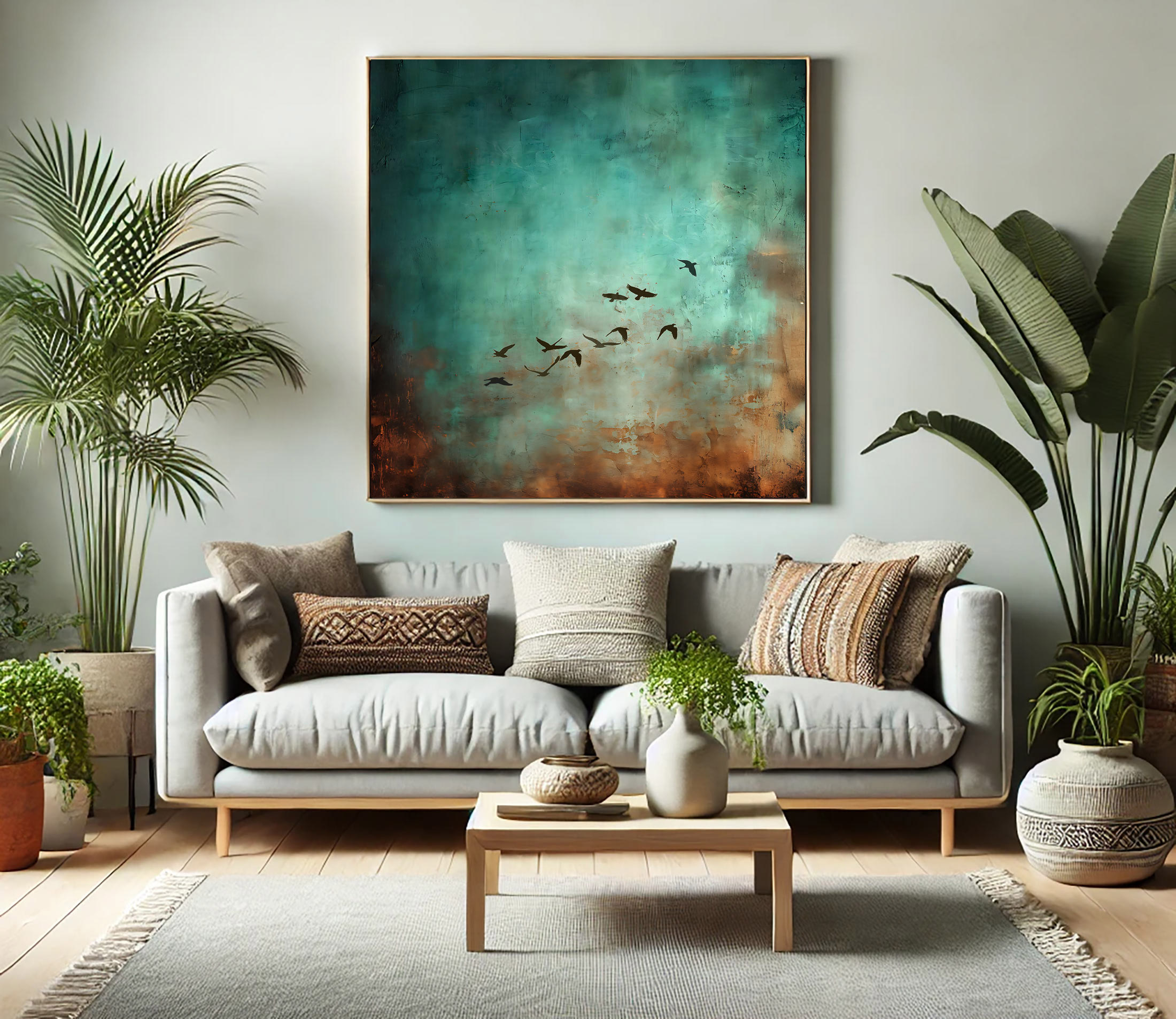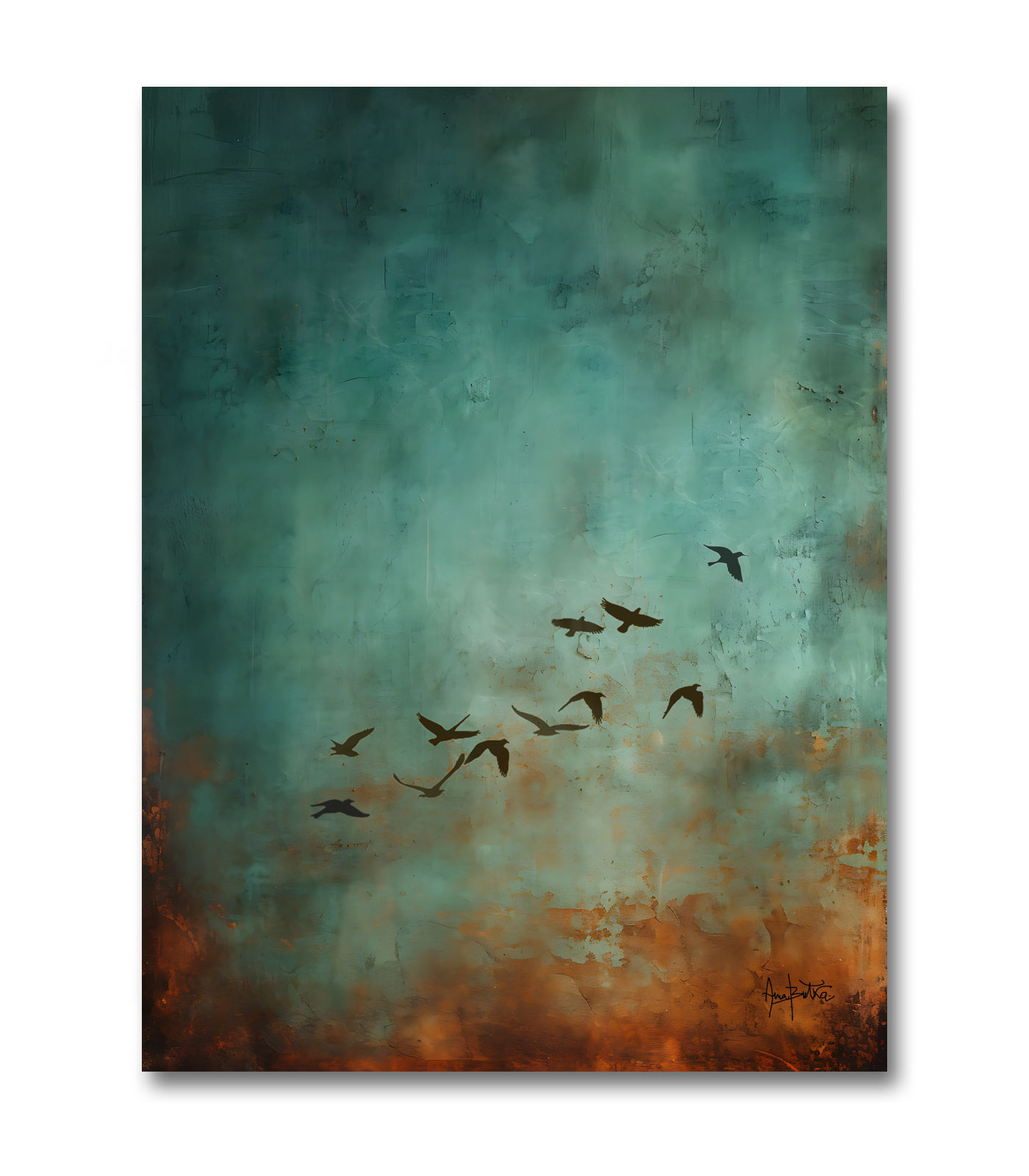 The green-turquoise background evokes open sky and vast natural space, while the bronze and warm accents ground the scene. The birds flying across the expanse symbolize escape, hope, collective energy and the beauty of nature in motion. Rendered in a modern abstract style, this artwork fits perfectly in contemporary, minimalist, Scandinavian or luxury interiors.