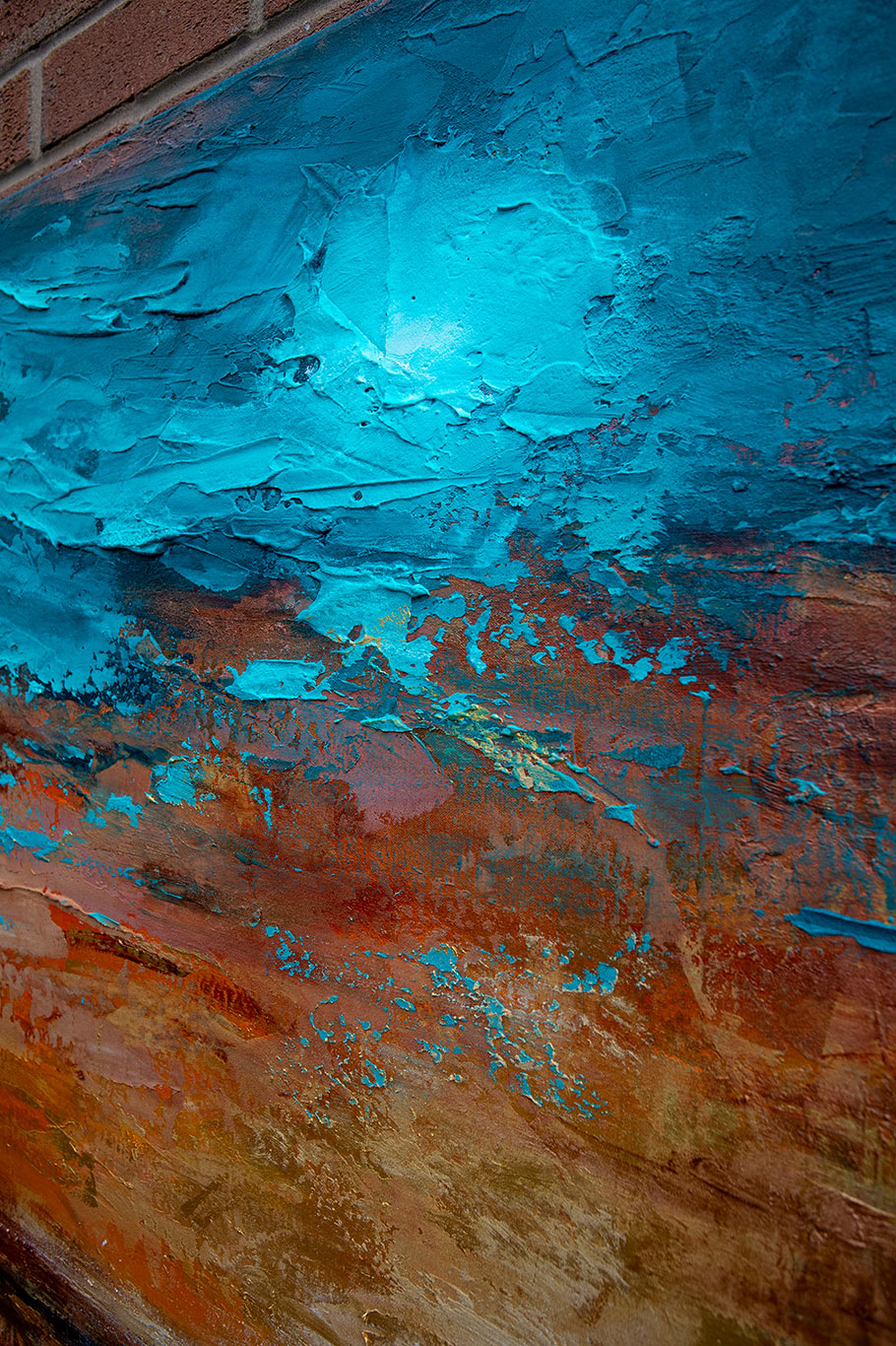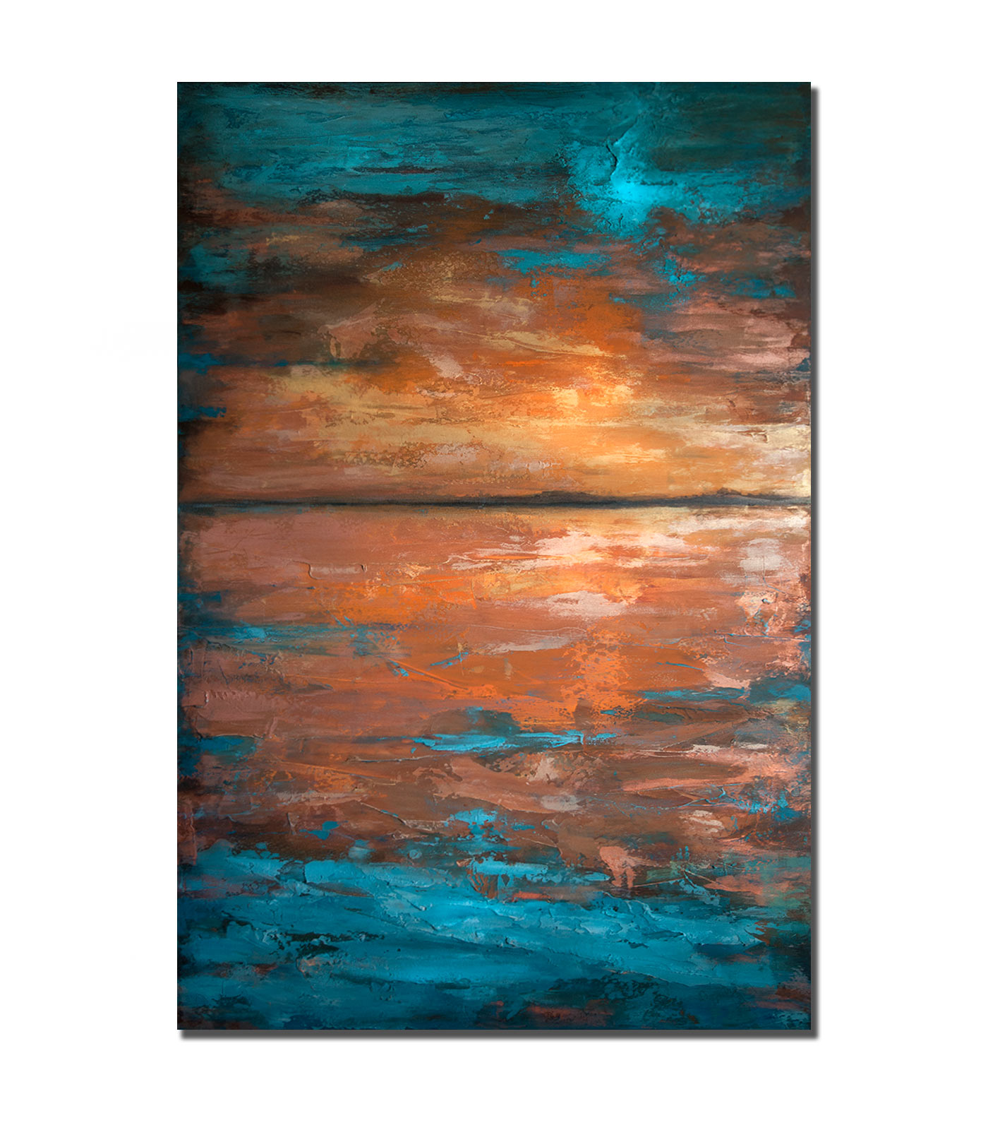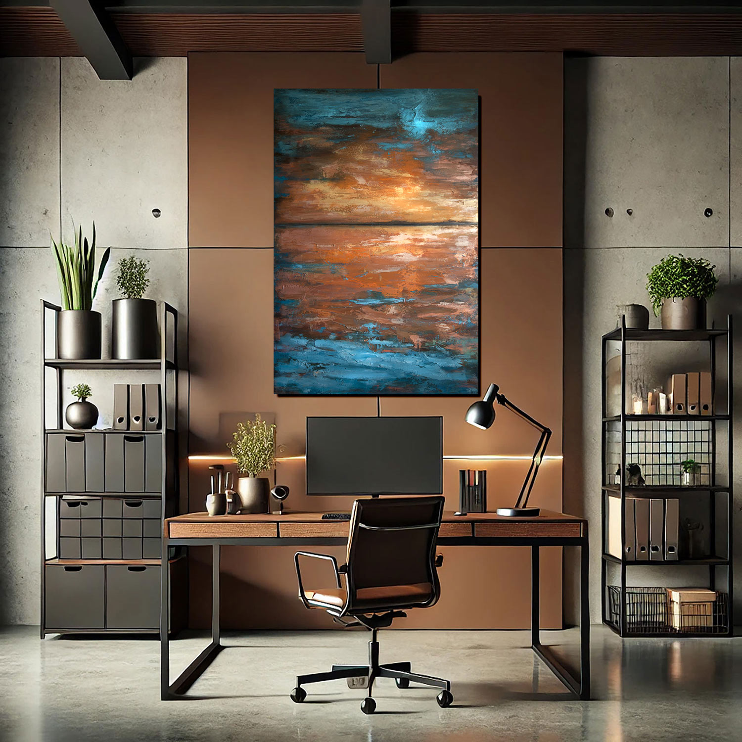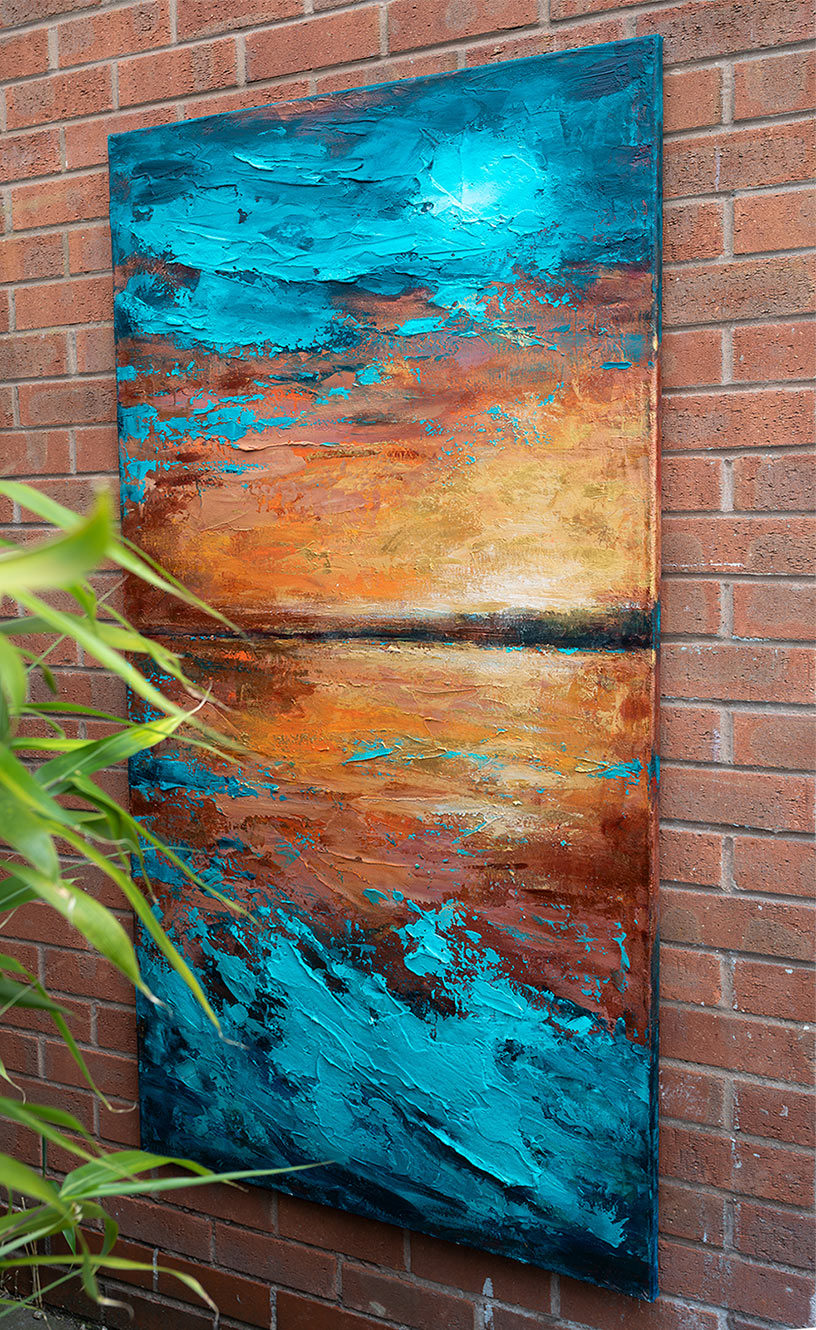 “Vibrant textured abstract painting featuring bright blue ocean tones blending with warm copper and sunset hues. This original landscape artwork brings depth and movement, perfect for modern living rooms, offices, or coastal-inspired interiors. A striking statement piece for contemporary home decor.”