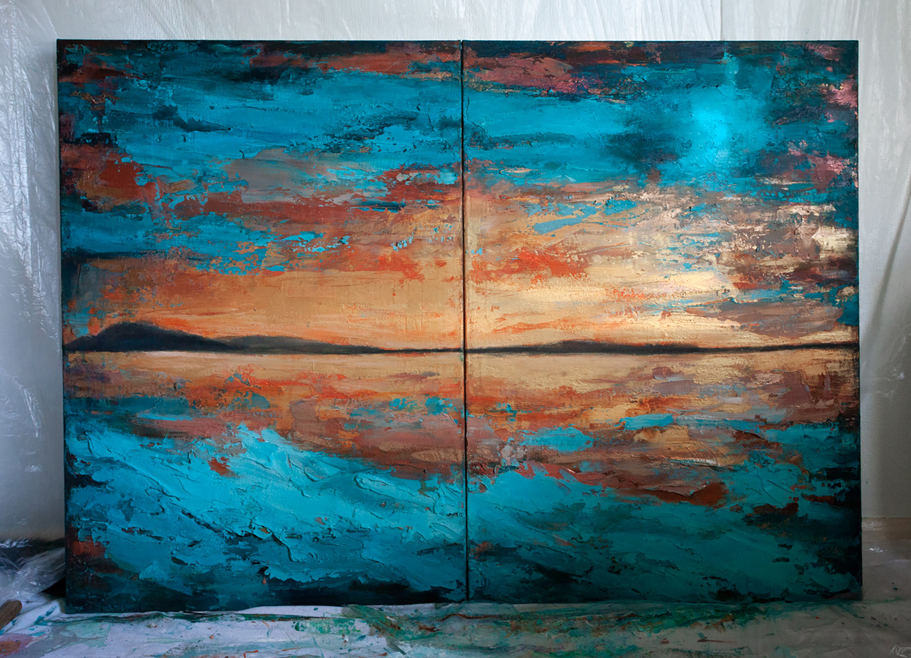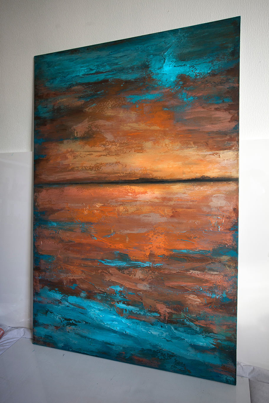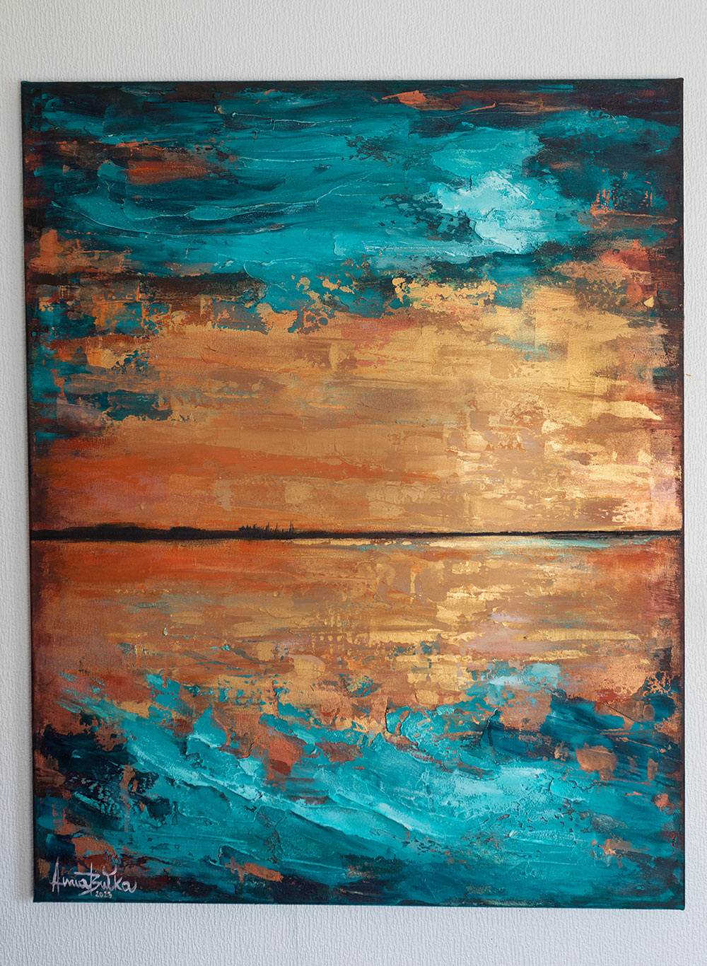 “Vibrant textured abstract painting featuring bright blue ocean tones blending with warm copper and sunset hues. This original landscape artwork brings depth and movement, perfect for modern living rooms, offices, or coastal-inspired interiors. A striking statement piece for contemporary home decor.”