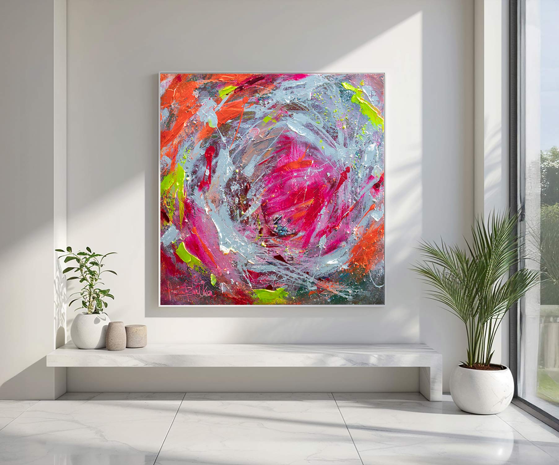 Strong visual impact thanks to the bold pink-white contrast