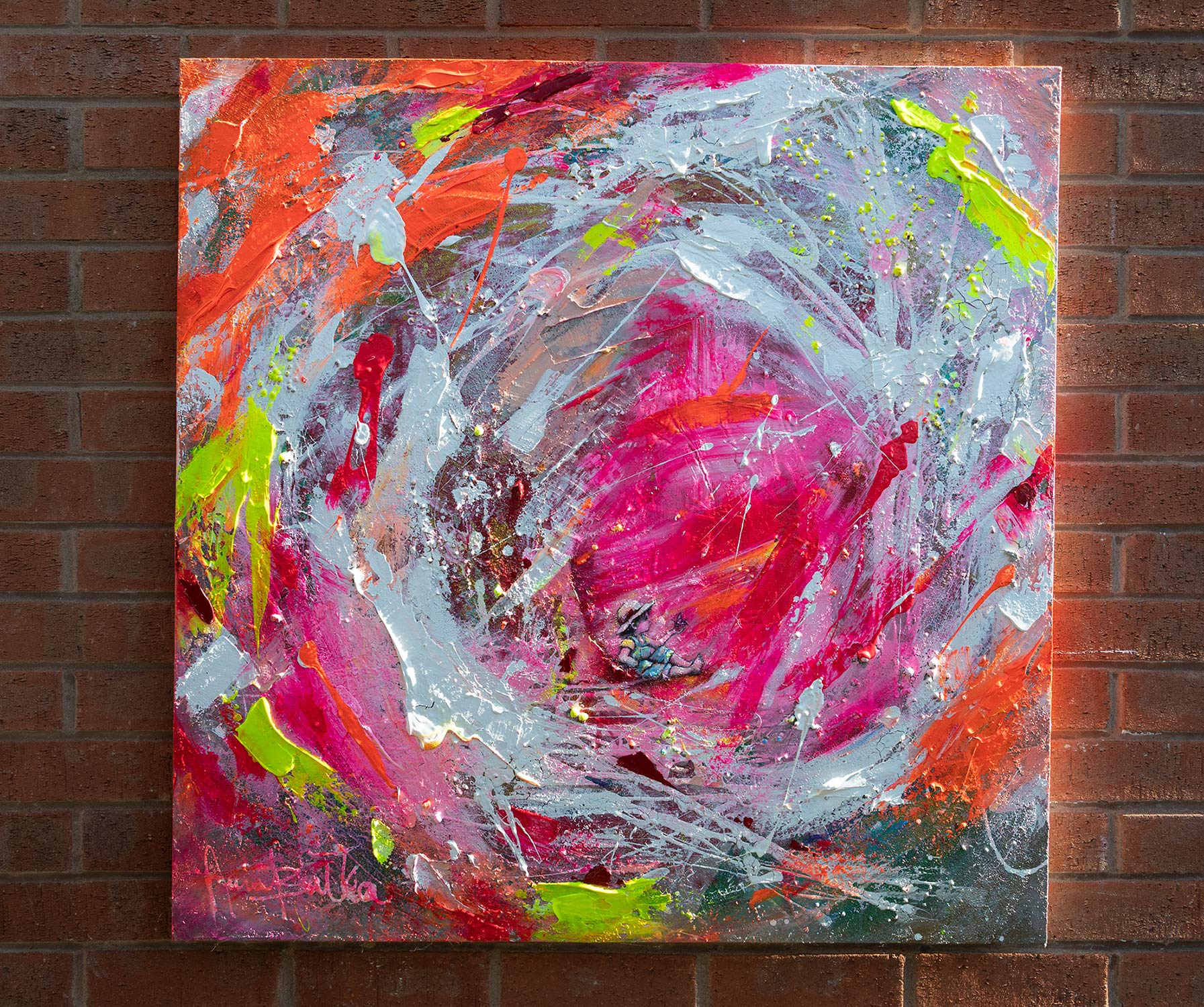 The child, positioned in the center, grounds the work. The surrounding colours appear to echo their imagination expanding outward like thoughts, dreams or emotions. It is a piece that speaks to parents, art collectors and anyone who values emotional storytelling in modern art.