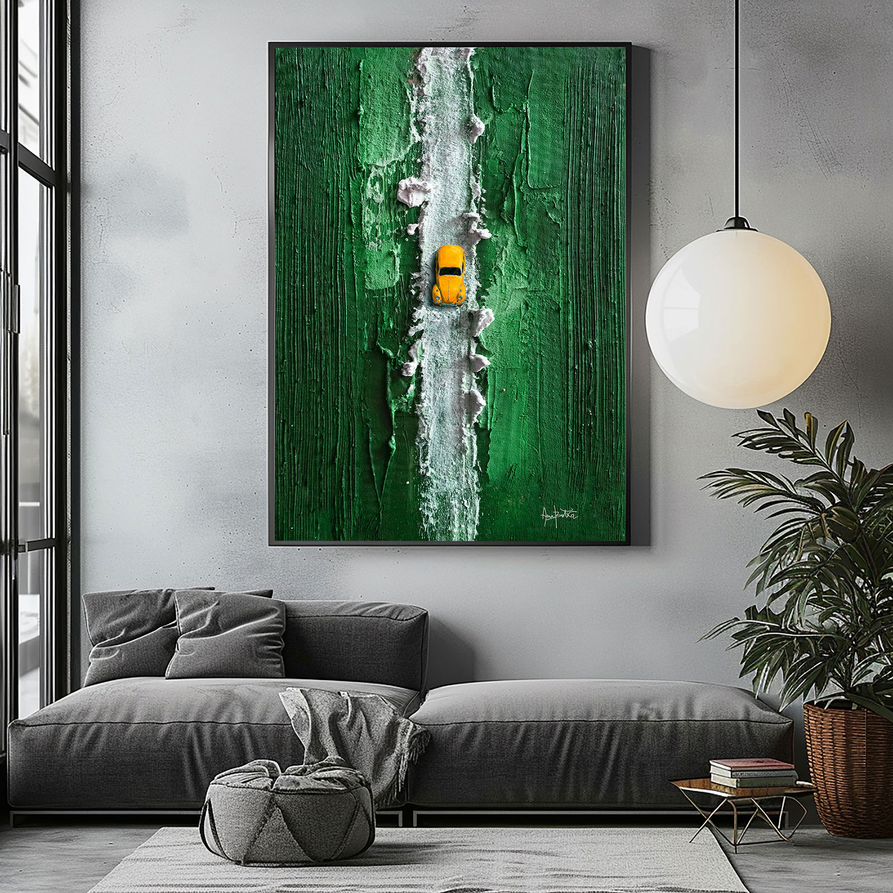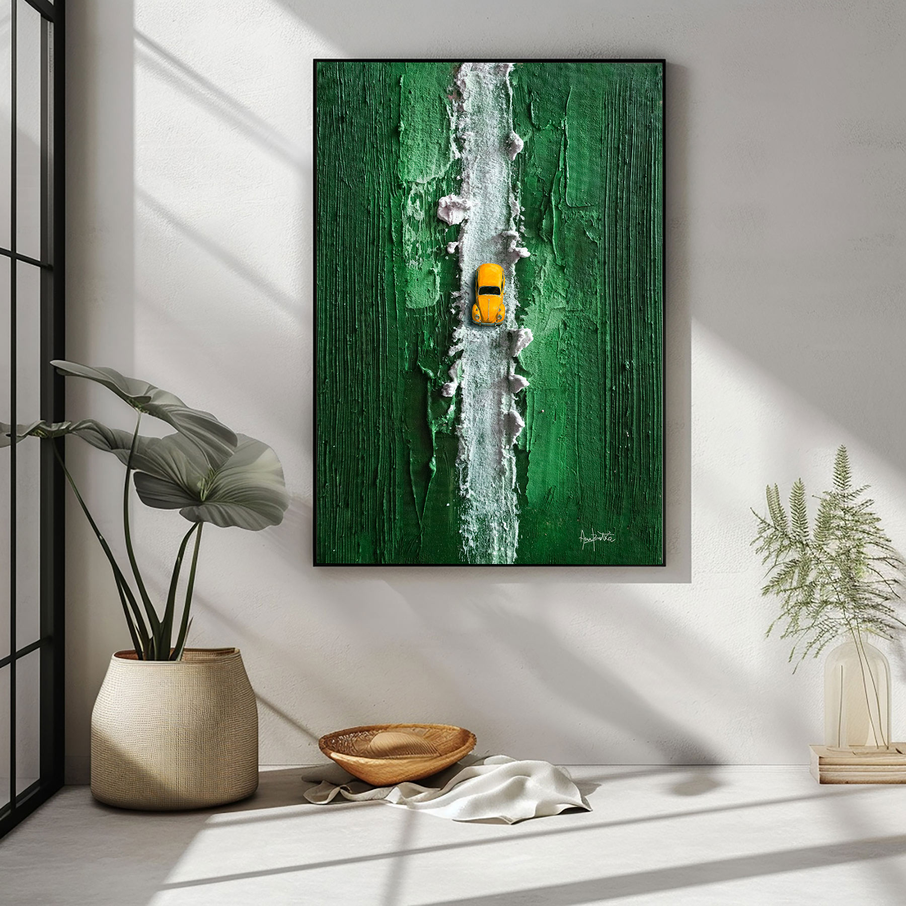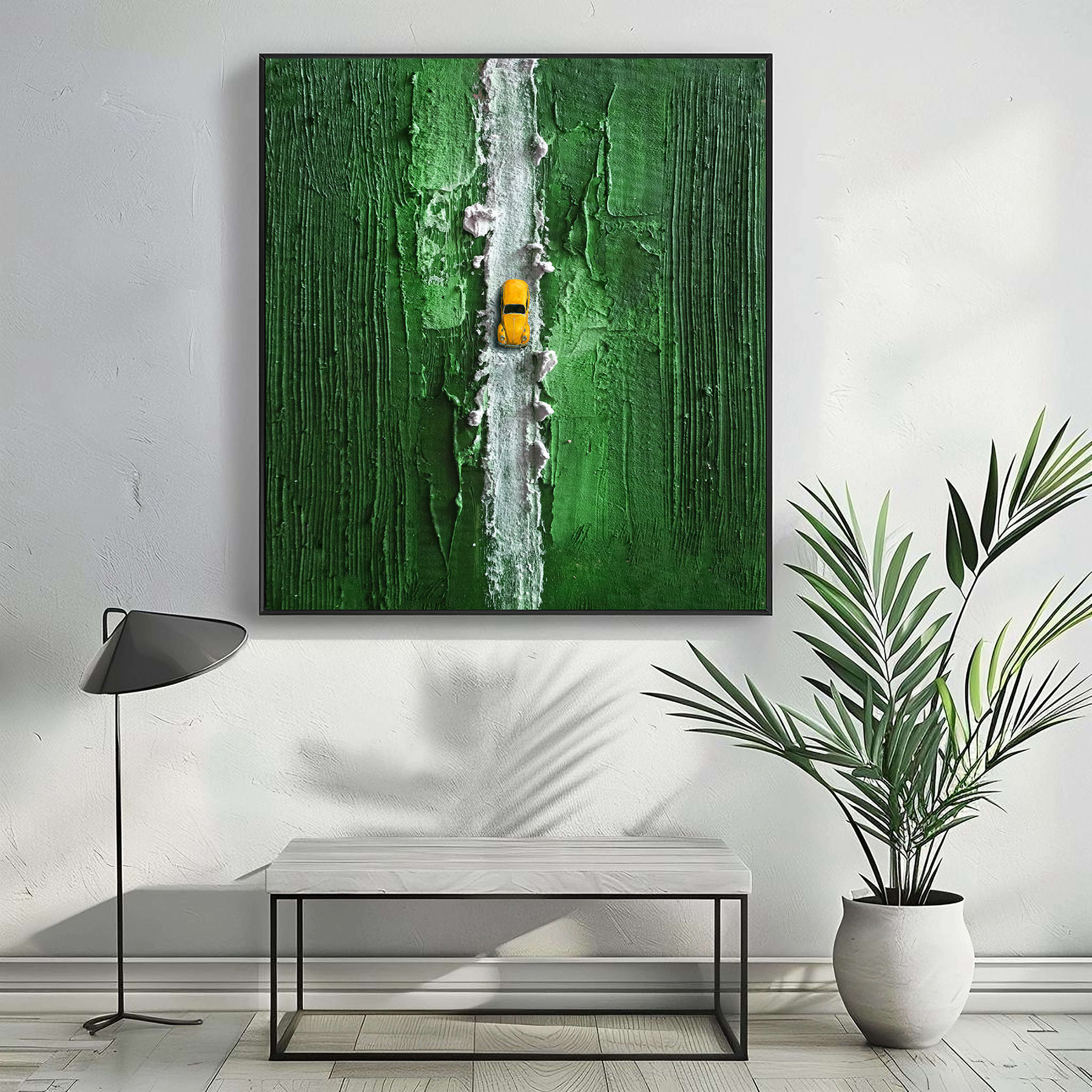 The composition invites exploration: the rugged textured surface evokes terrain or motion, while the car motif provides dynamic narrative and design edge. Green symbolises growth, energy and renewal, while the car adds individuality and interest.