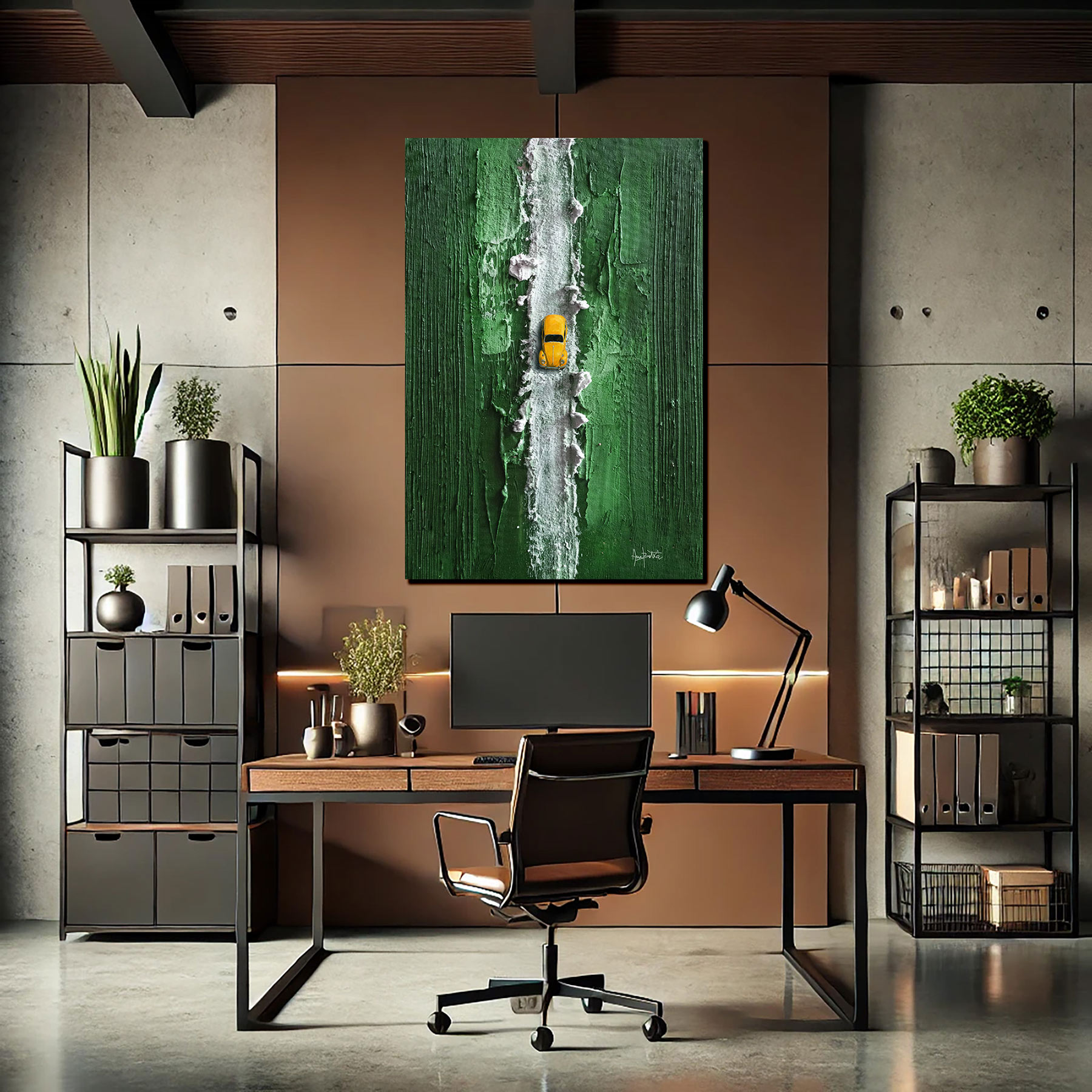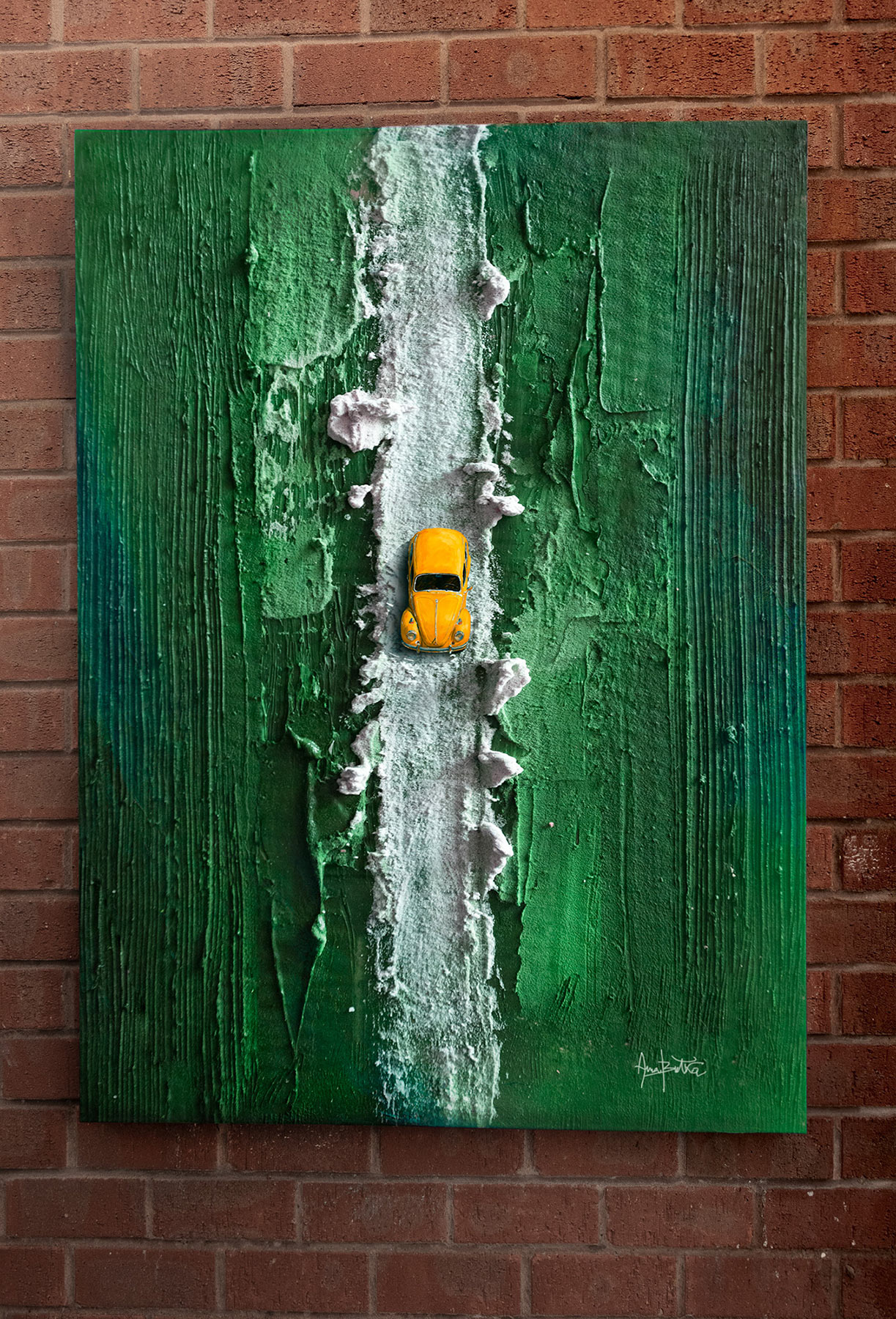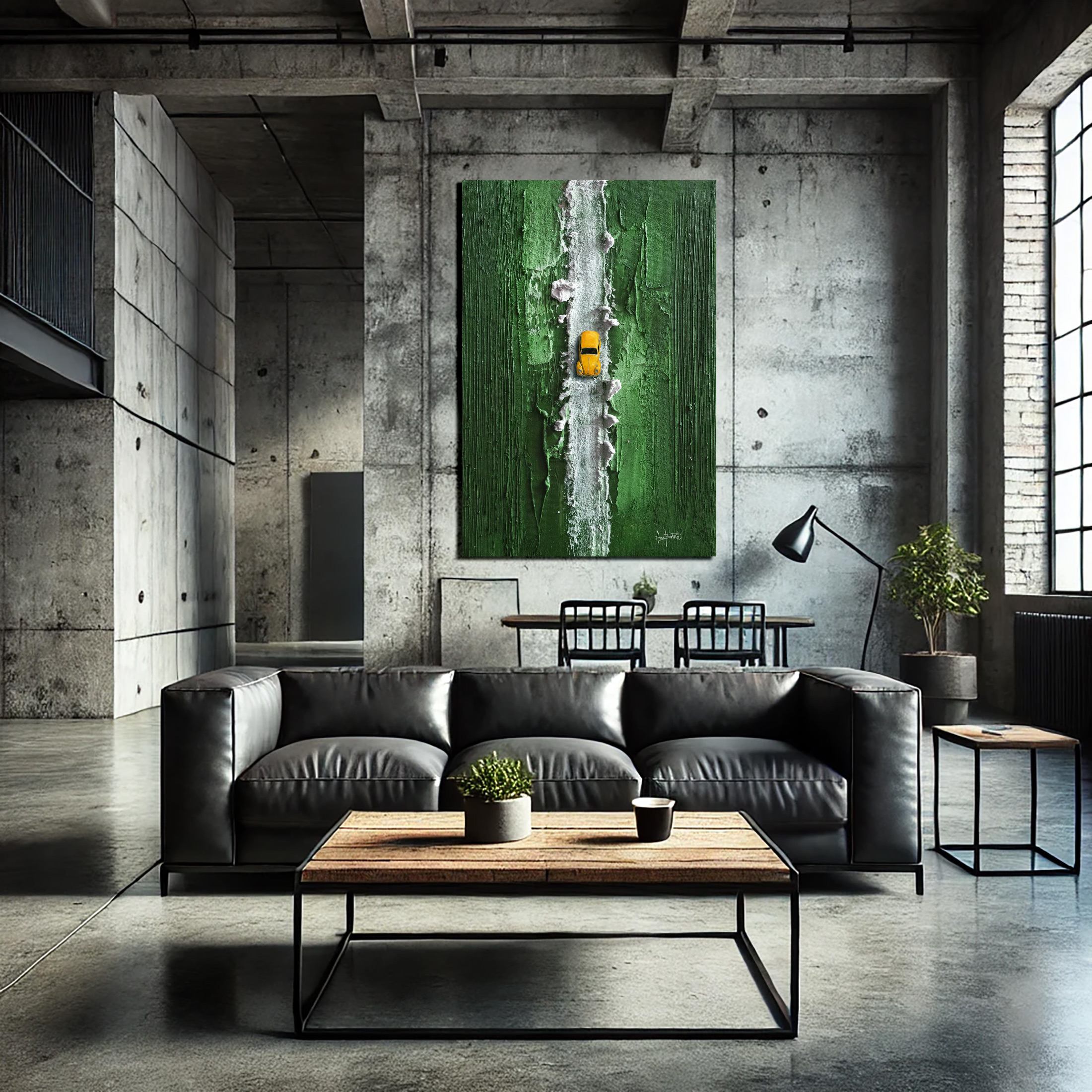 The composition invites exploration: the rugged textured surface evokes terrain or motion, while the car motif provides dynamic narrative and design edge. Green symbolises growth, energy and renewal, while the car adds individuality and interest.