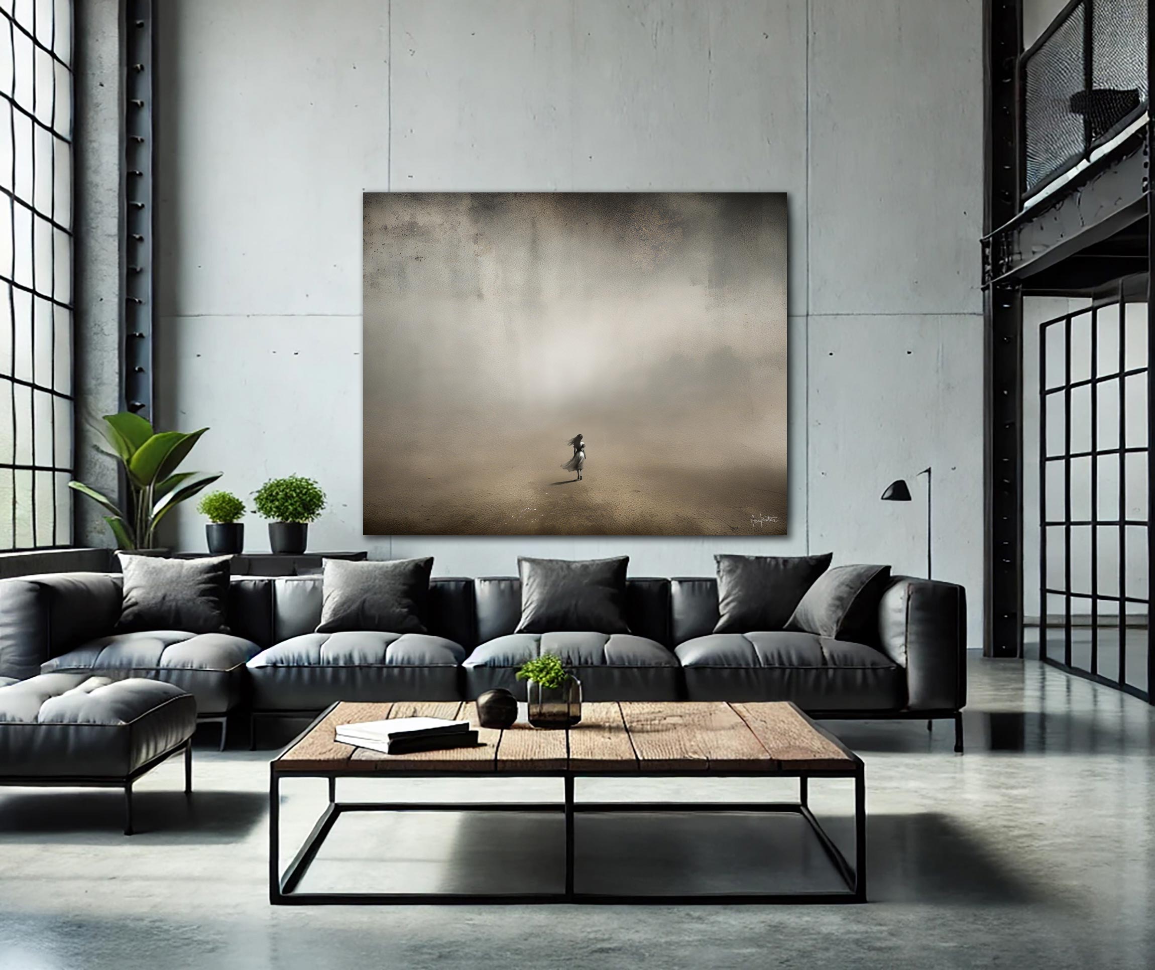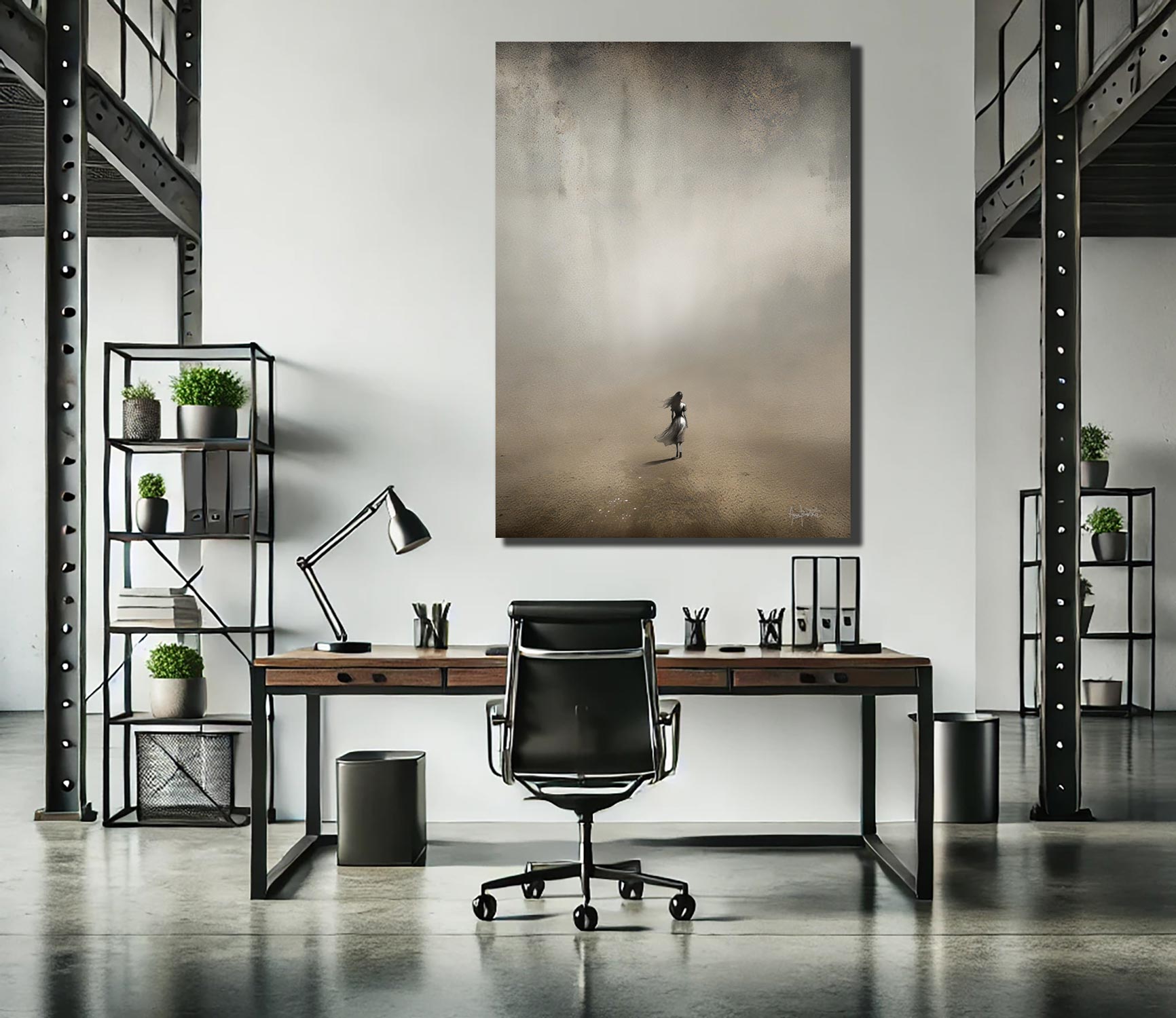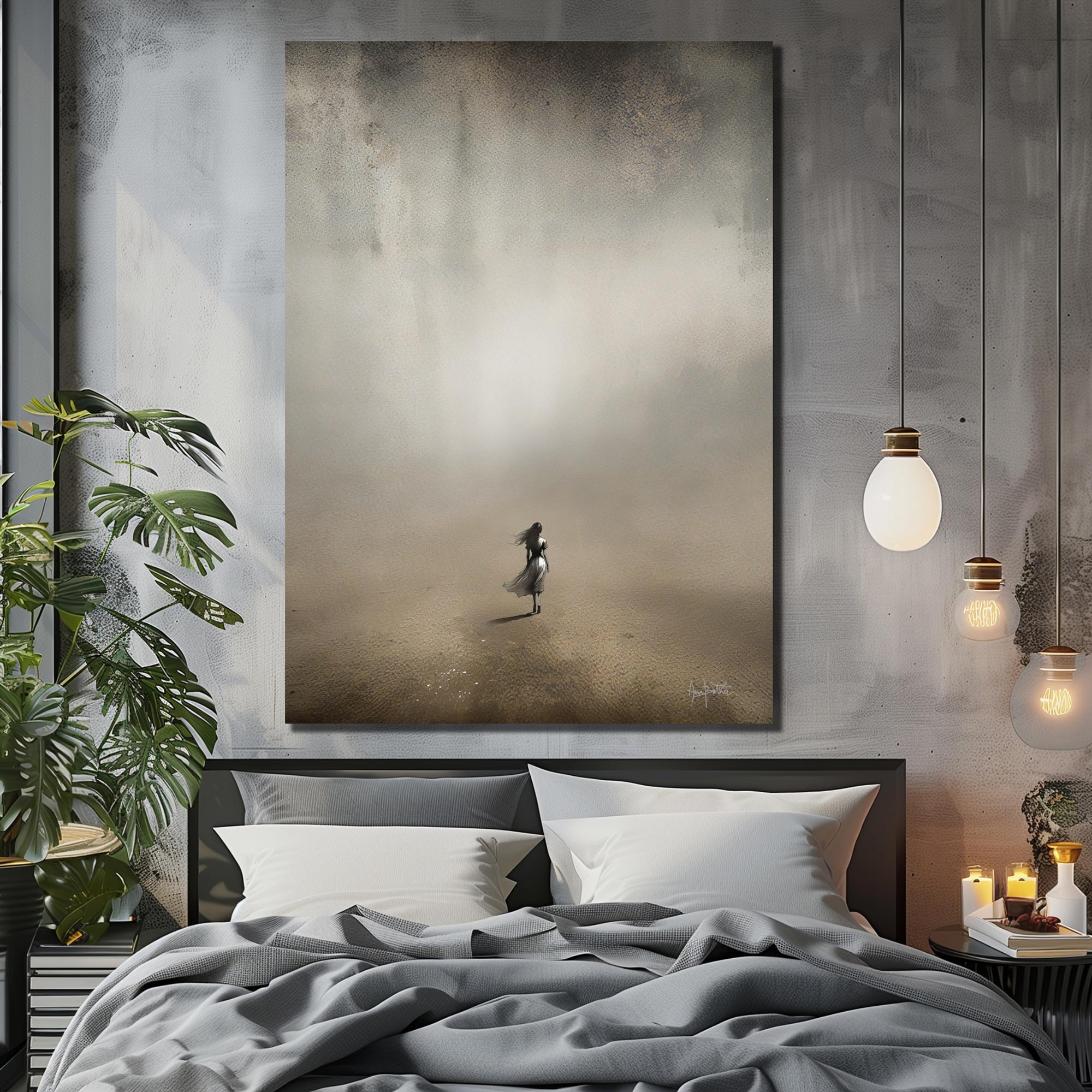Minimalist surreal landscape painting of a solitary woman walking into misty horizon. Atmospheric contemporary artwork about solitude, courage and the quiet journey forward.