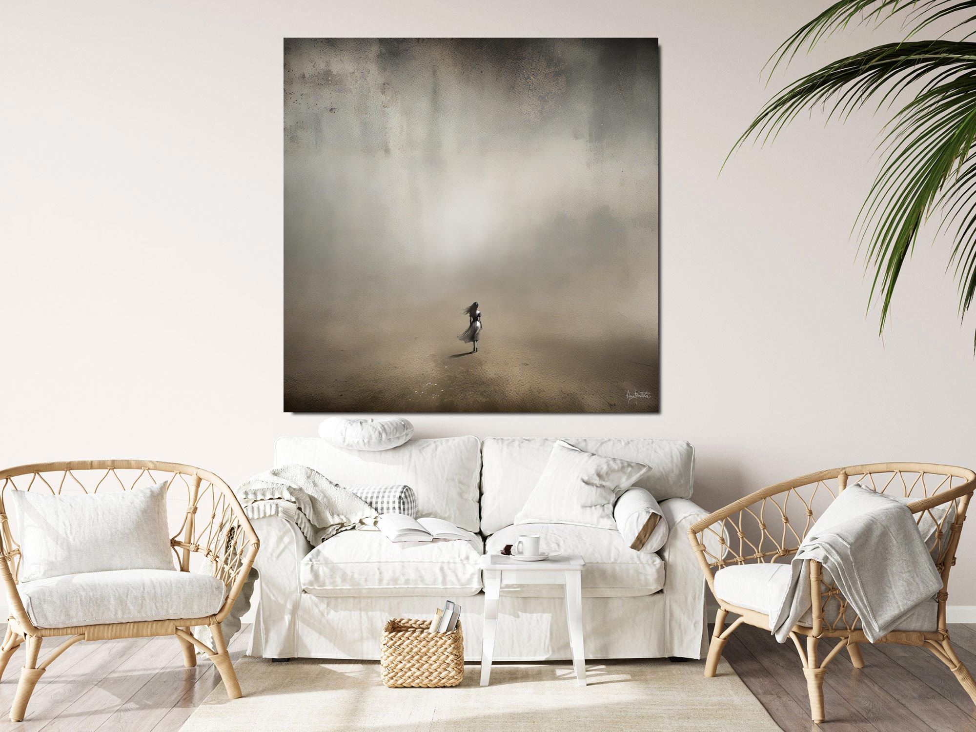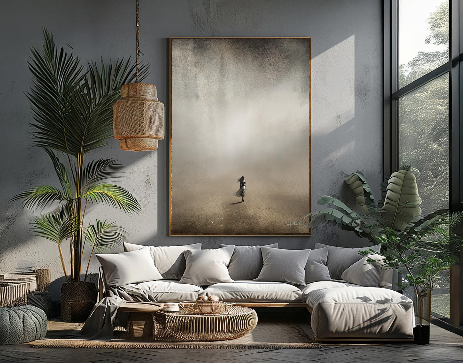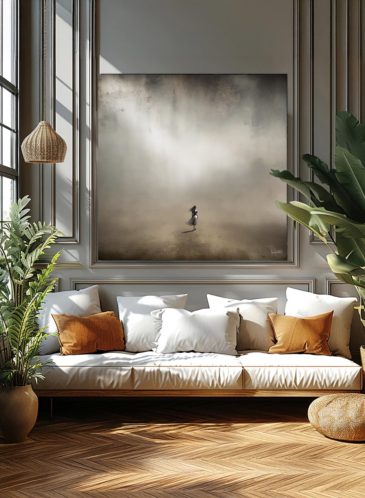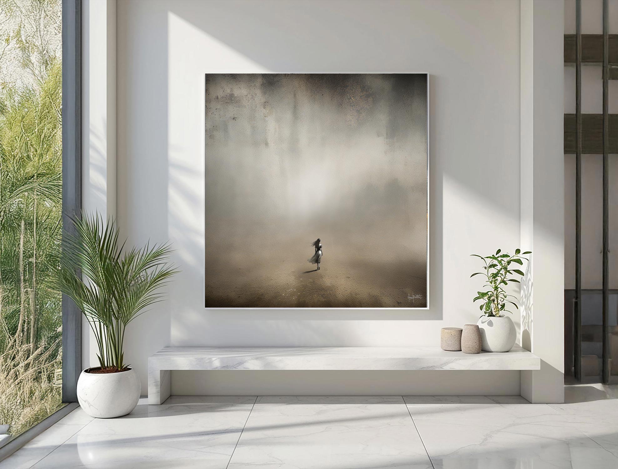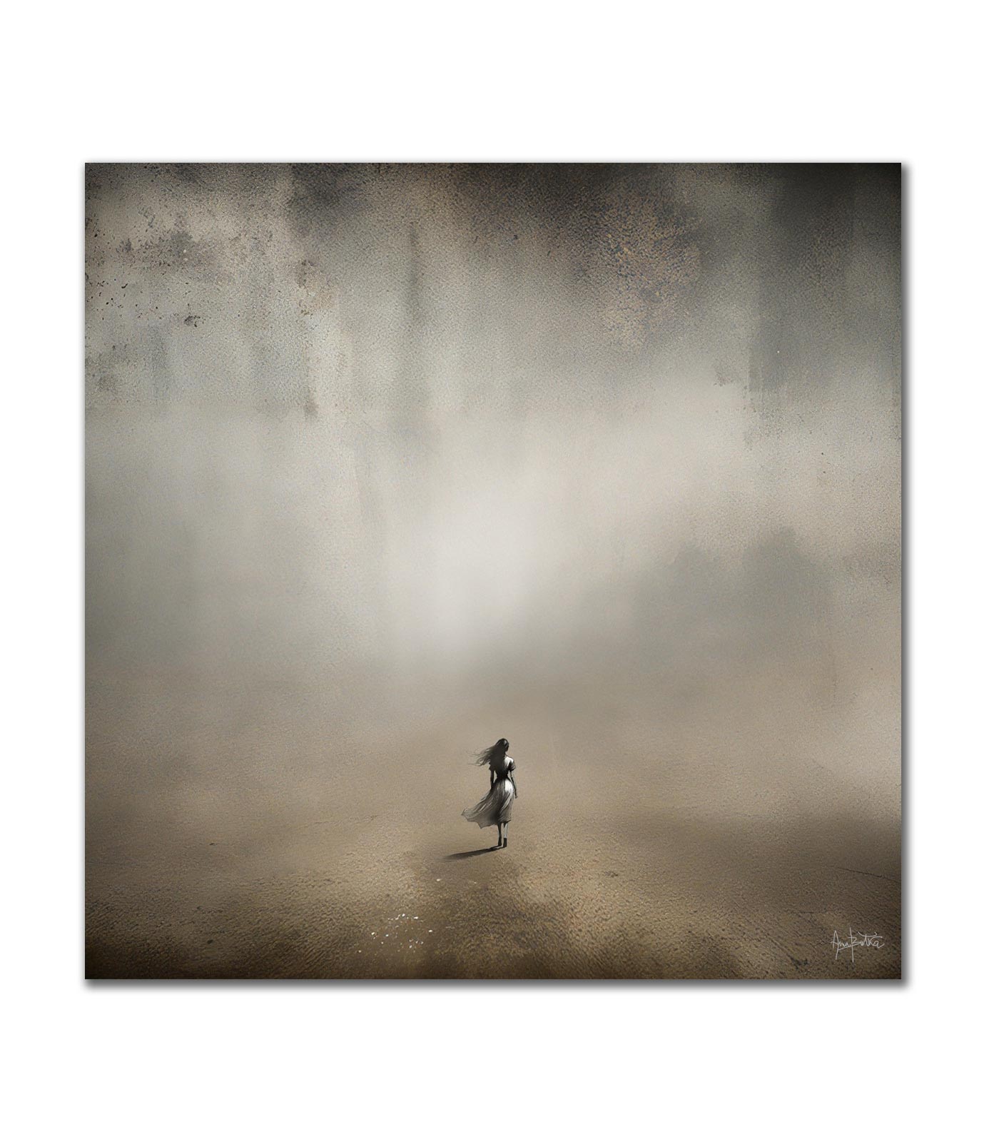 This minimalist surreal landscape artwork shows a solitary woman walking through a vast, misty space where earth and sky merge into one endless horizon. Her small figure contrasts with the immense landscape around her, creating a powerful visual story about solitude, courage and moving forward into the unknown.