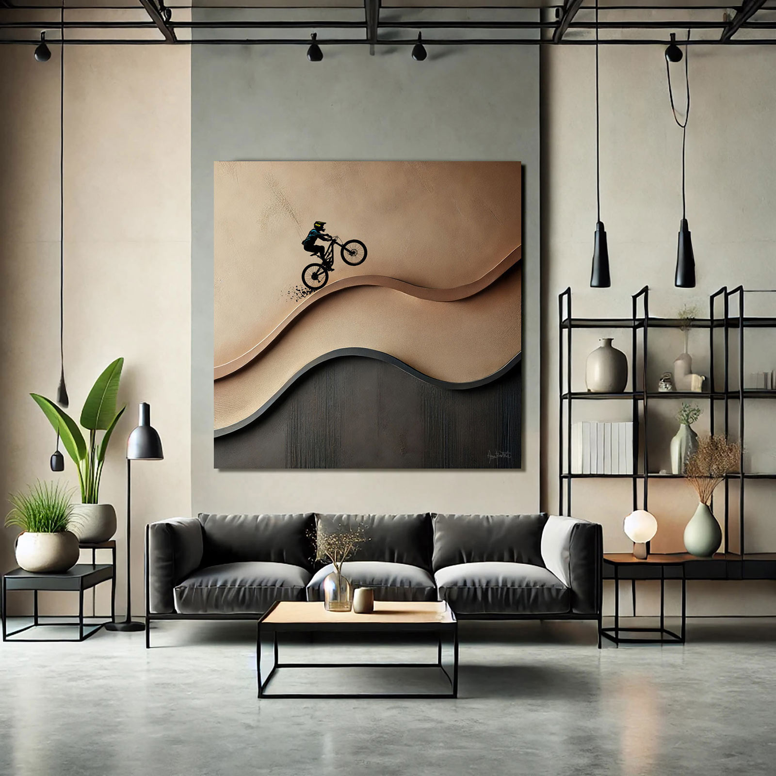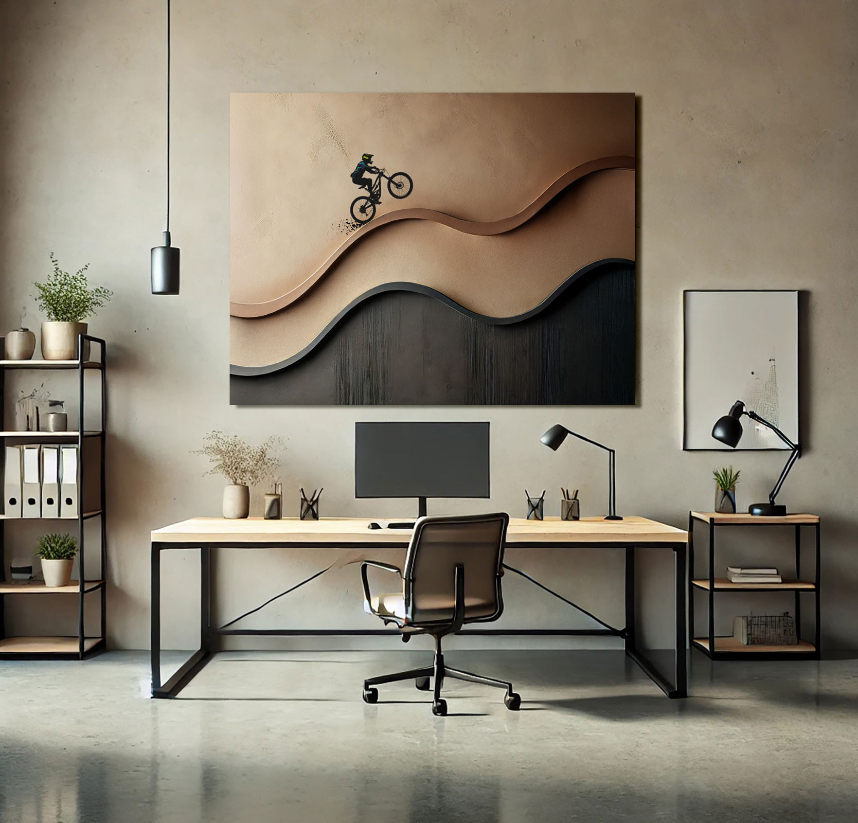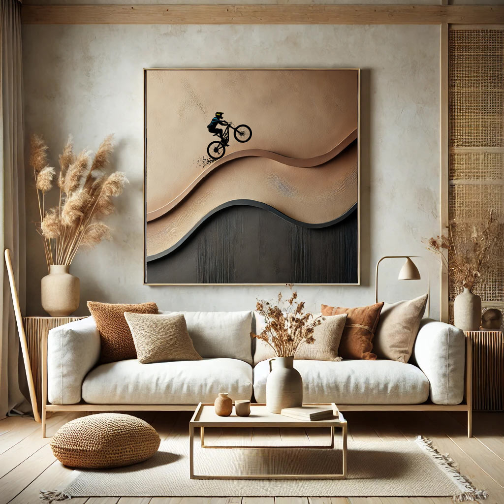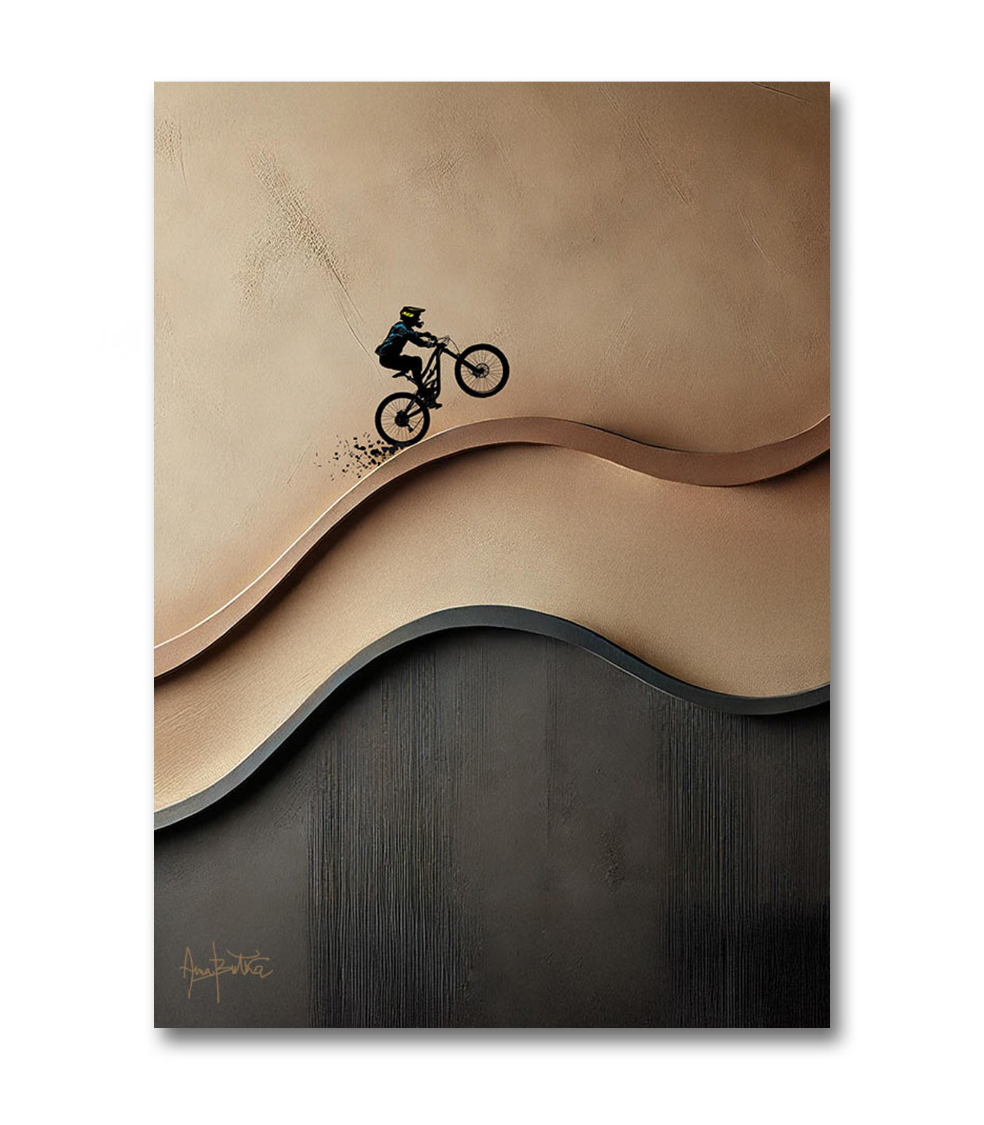 This original painting captures the freedom and energy of the mountain bike in a bold yet minimalist way. Hand-painted on stretched canvas with textured layers, it presents a cyclist moving through a brown abstract landscape combining sport, motion and modern art into one striking piece.