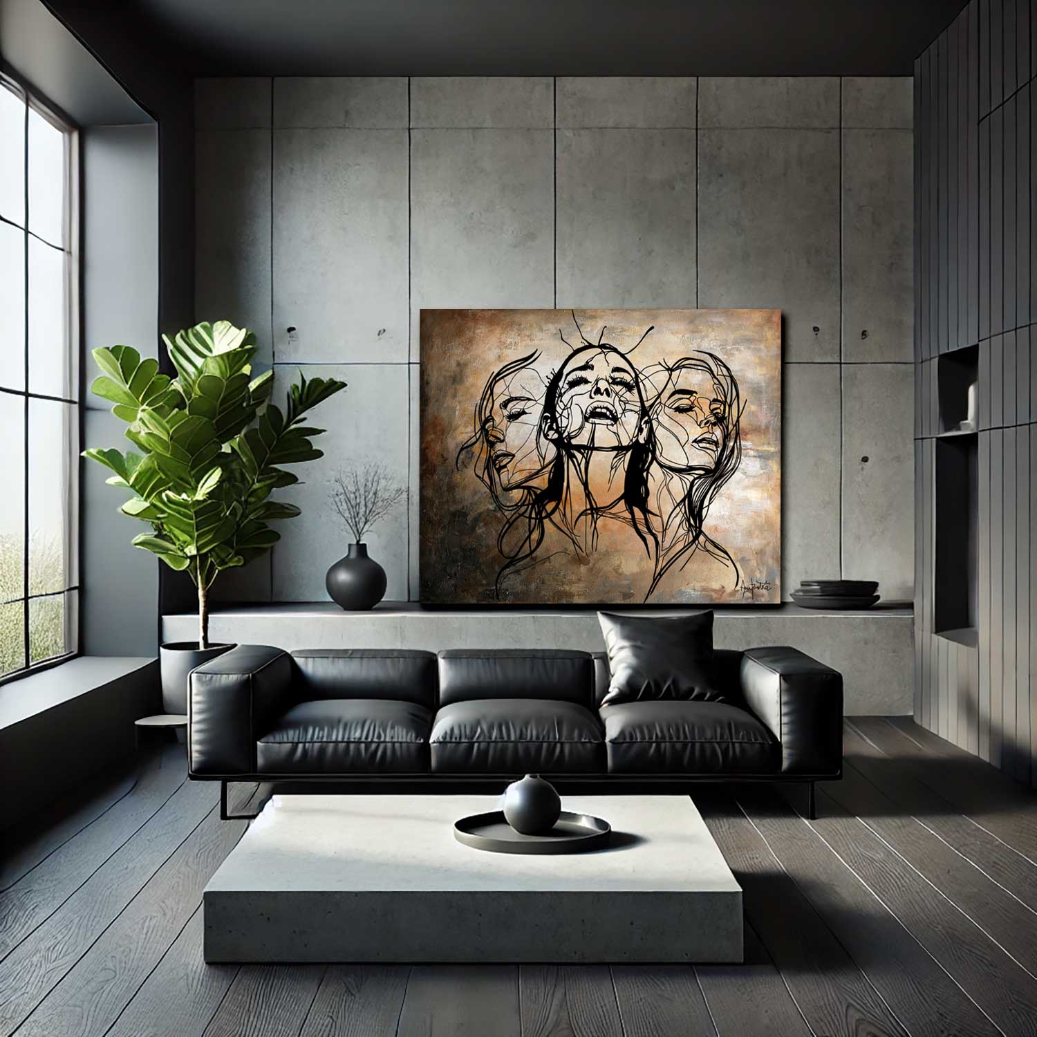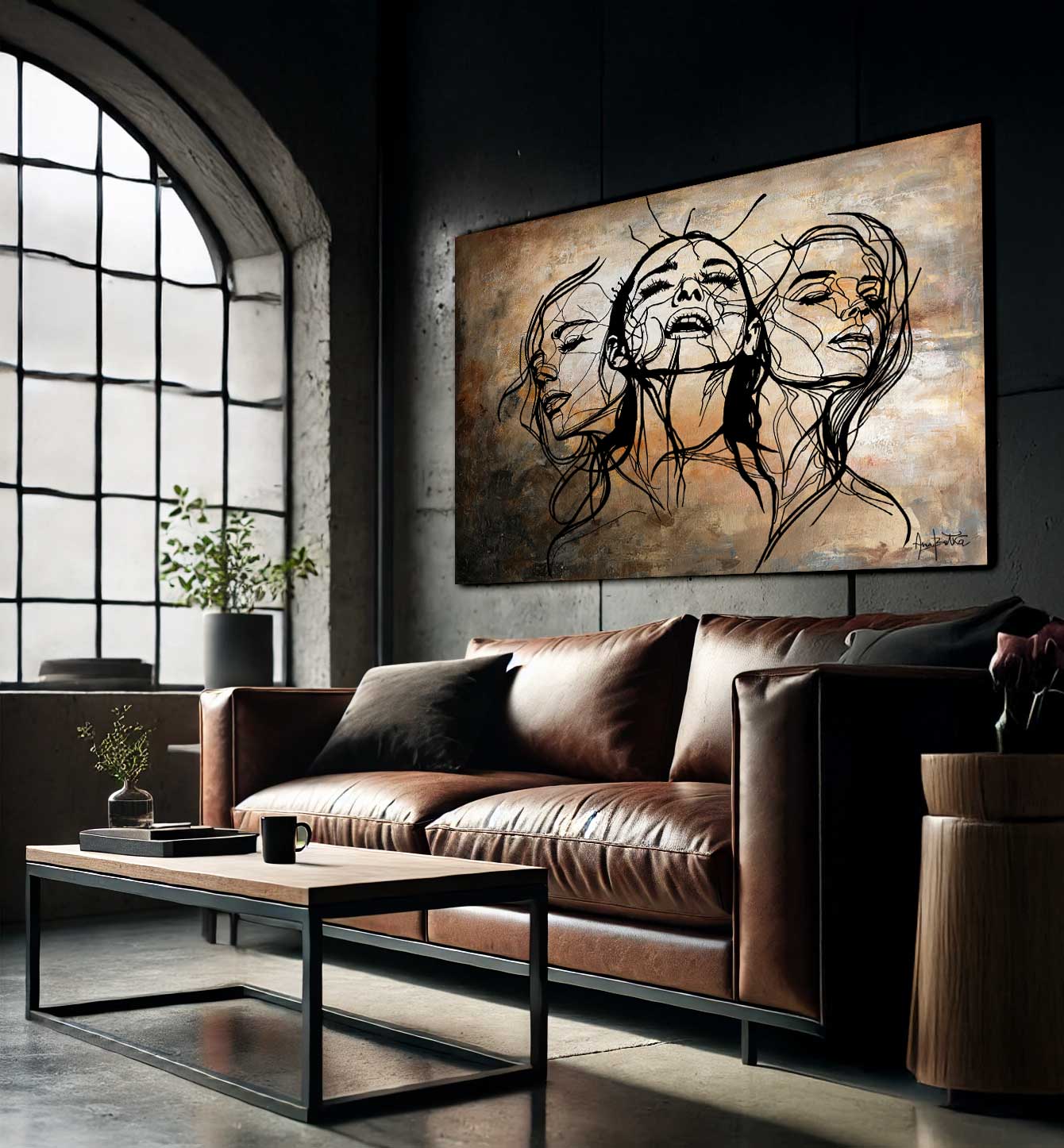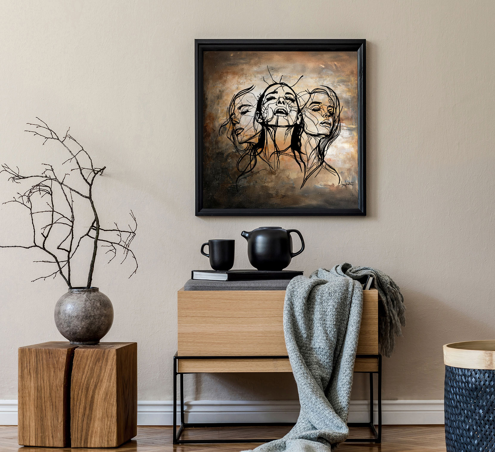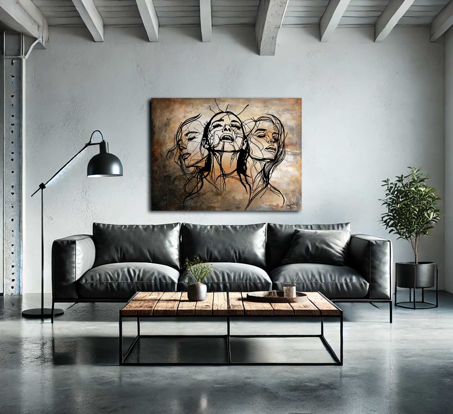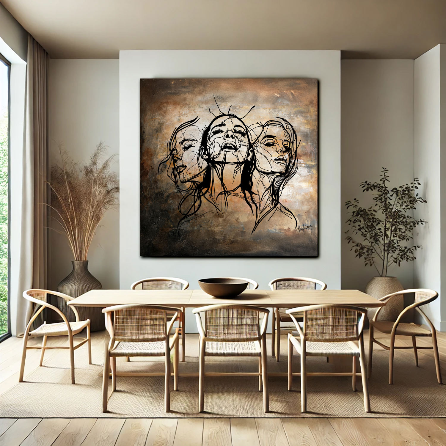 Bold black lines move across an earthy, textured canvas, creating striking contrast and rhythm. These lines feel alive like energy, memory and intuition tracing the emotional landscape of the three women. The warm beige and brown tones ground the composition, adding elegance and softness while maintaining a modern, contemporary look.