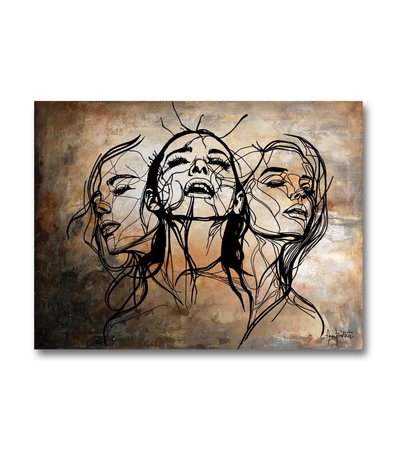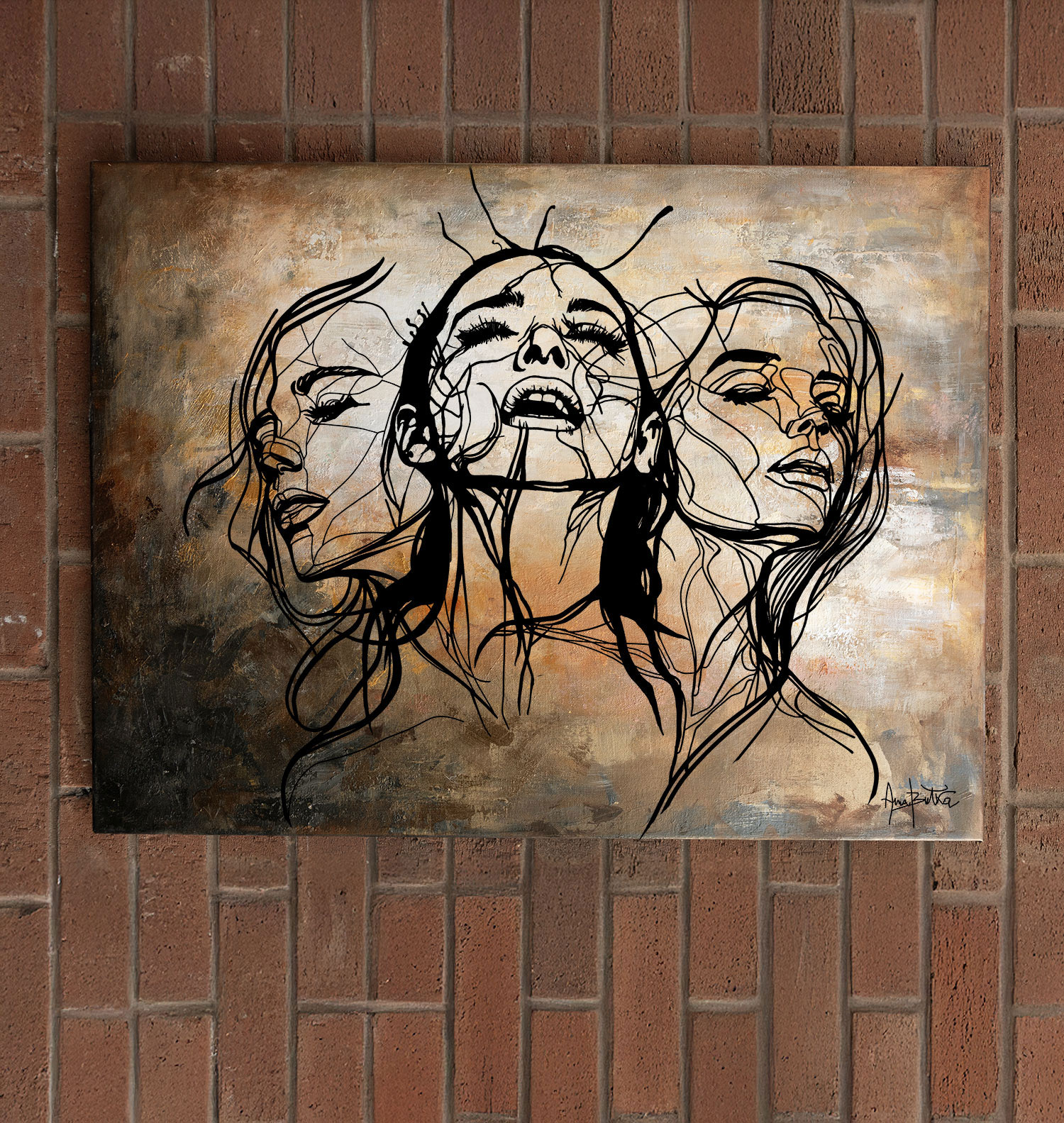 “The Three Graces – Body and Soul” is a deeply expressive abstract woman portrait painting that captures the essence of femininity, emotion and transformation. Three female faces share the canvas interconnected yet individually distinct representing the fluidity of the human experience: serenity, strength and passion woven together into one soul.