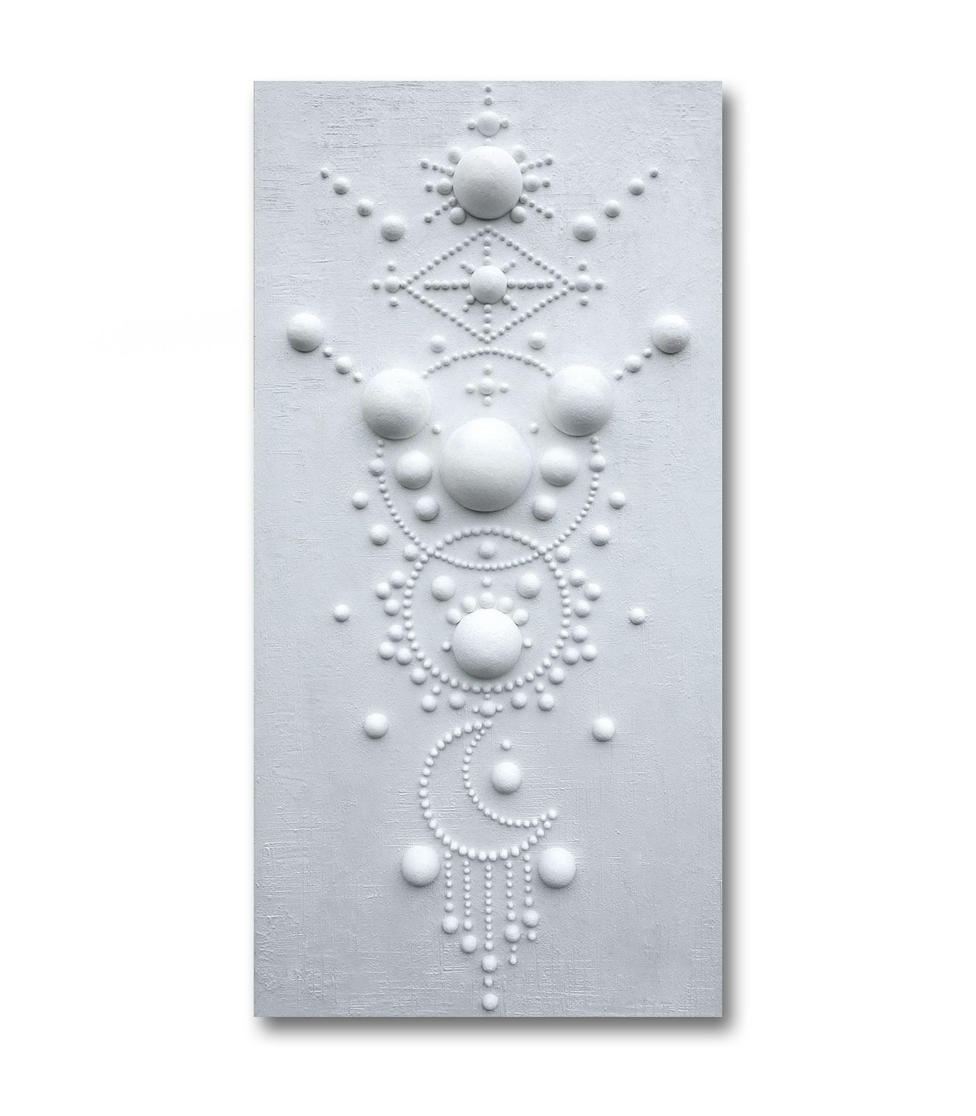 The composition features a harmony of raised spheres and a crescent-like form arranged in a balanced, geometric structure. The crisp white monochrome palette creates a refined, luxurious effect while allowing shadows and light to move across the surface, changing the look throughout the day. This interplay makes the artwork “alive” — always offering new visual impressions depending on the ambient light.