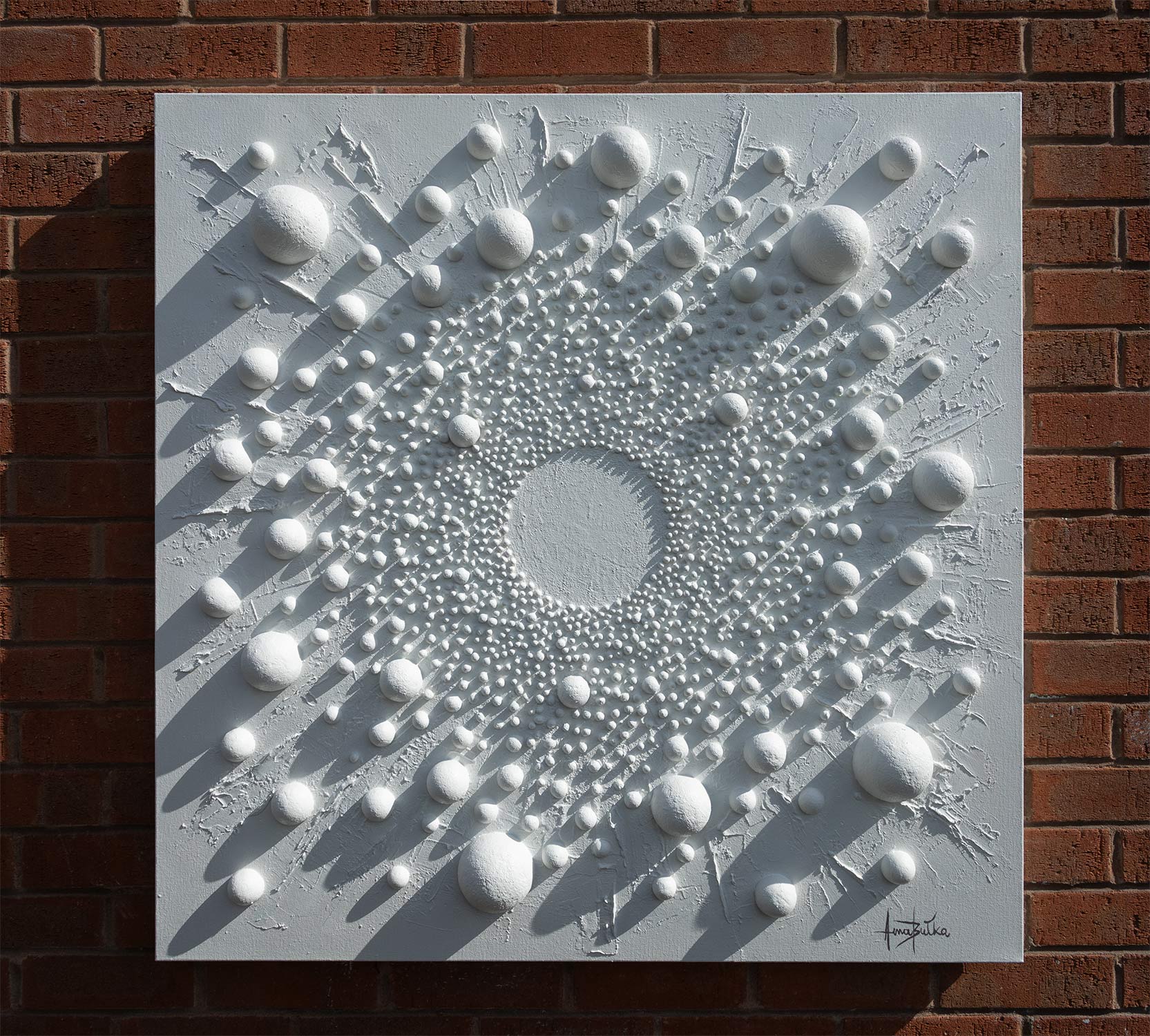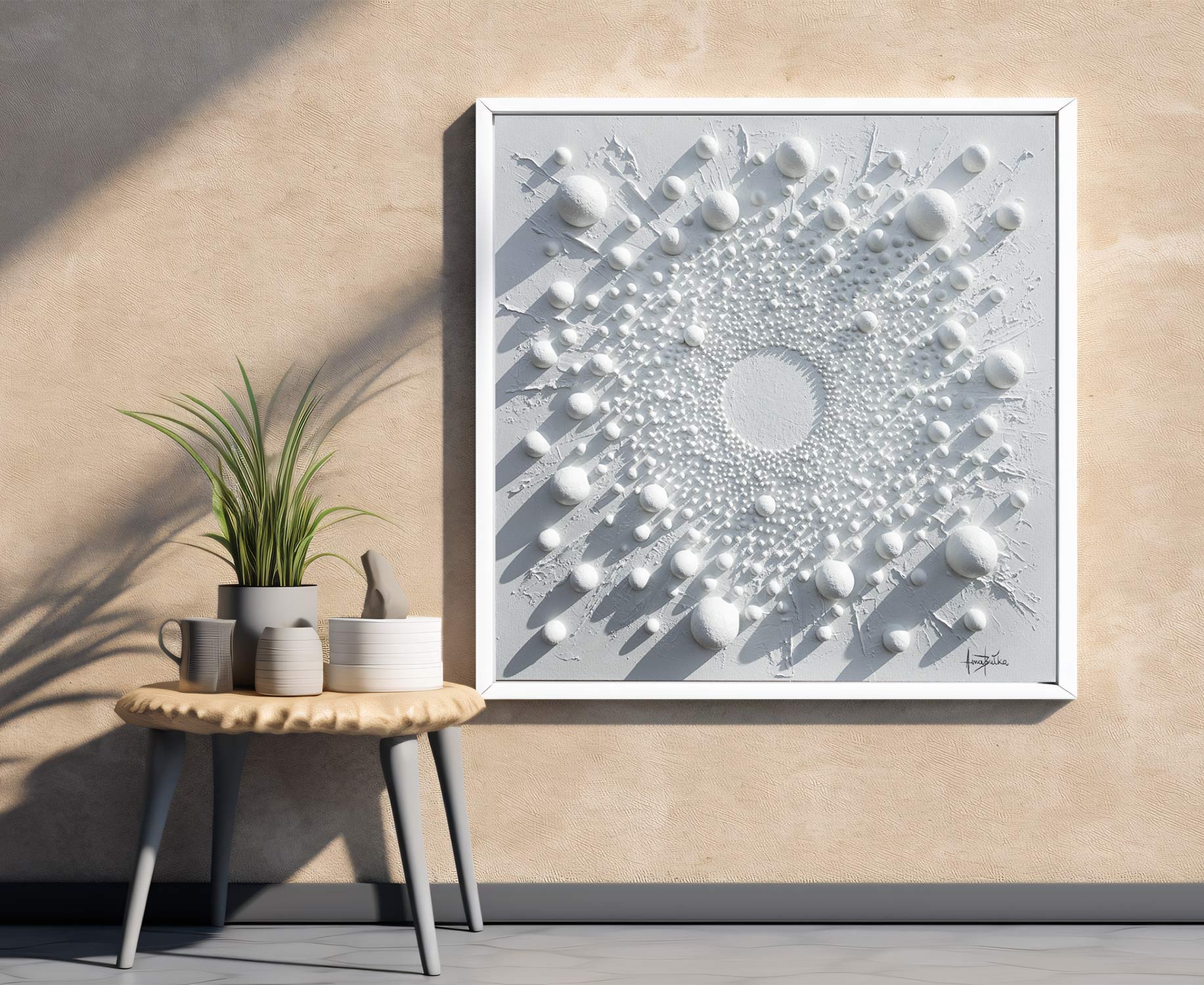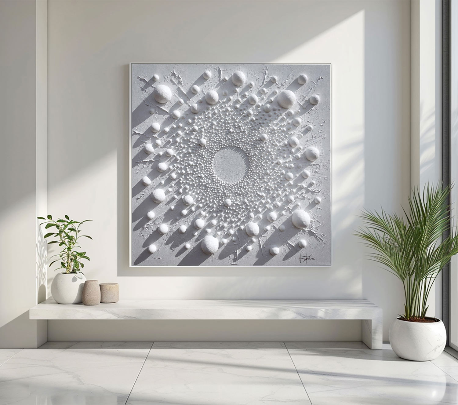 Introducing a striking, architectonic piece of wall sculpture art titled “Lunar Resonance”, created by artist Anna Marija Bulka. This large-format mixed-media artwork captures a radiant, circular abstract composition a central “moon-like” form surrounded by a burst of textured spheres, all rendered in monochrome white for a clean, minimalist aesthetic.