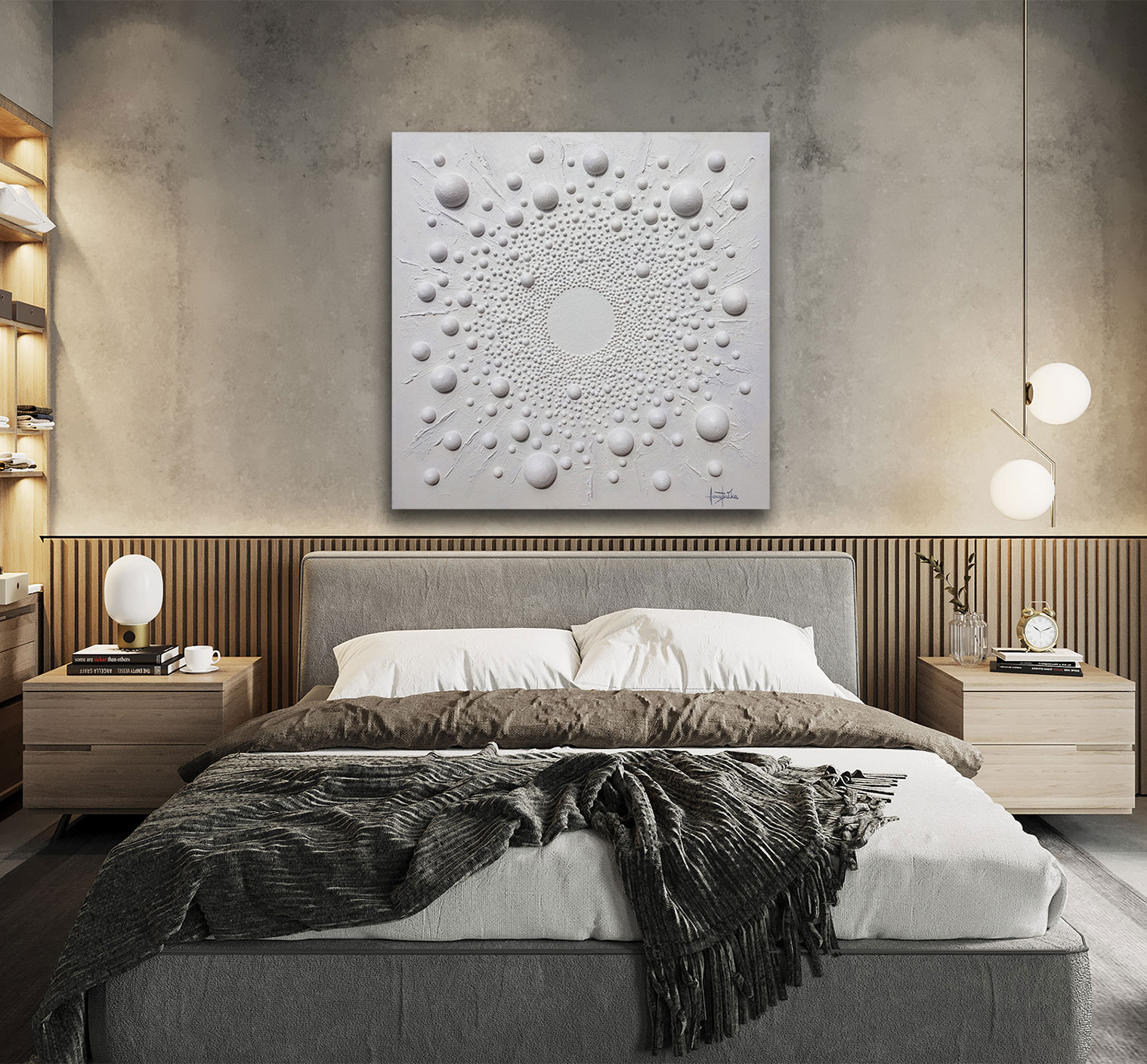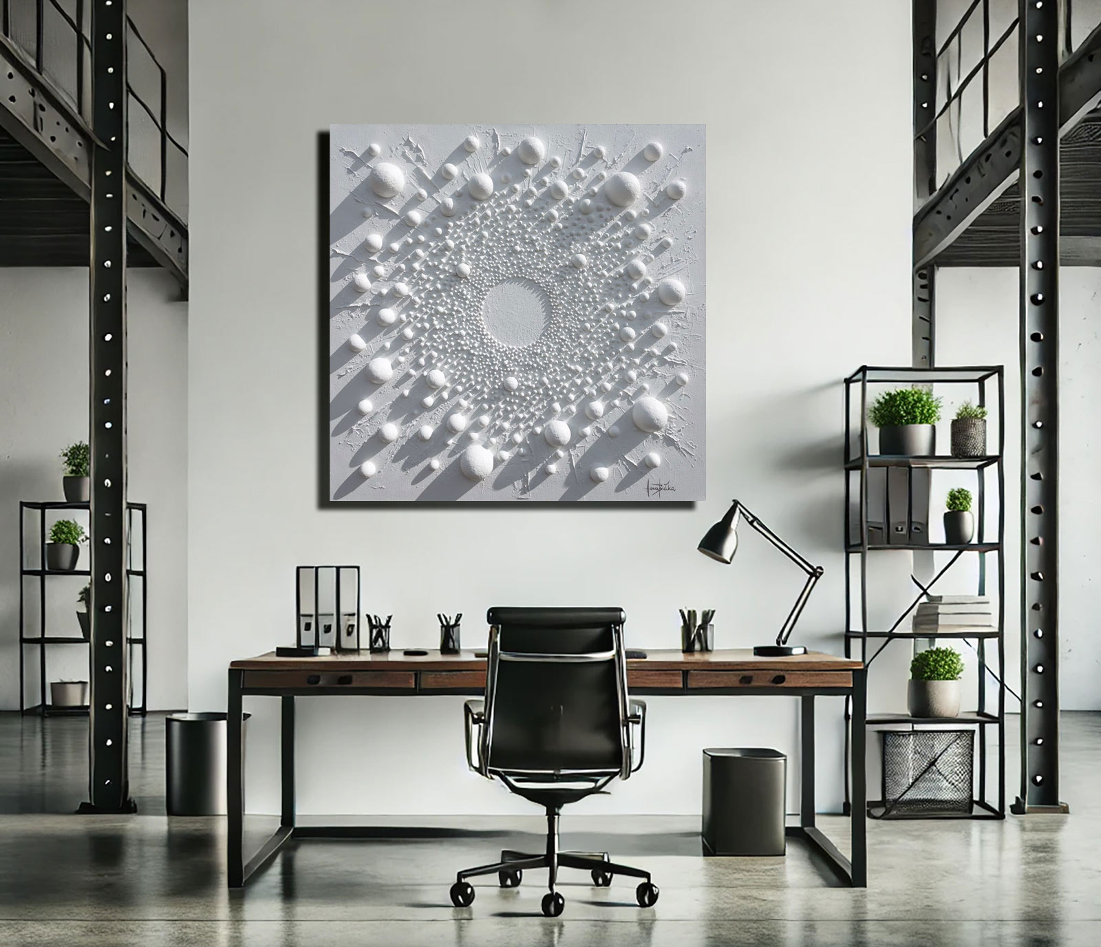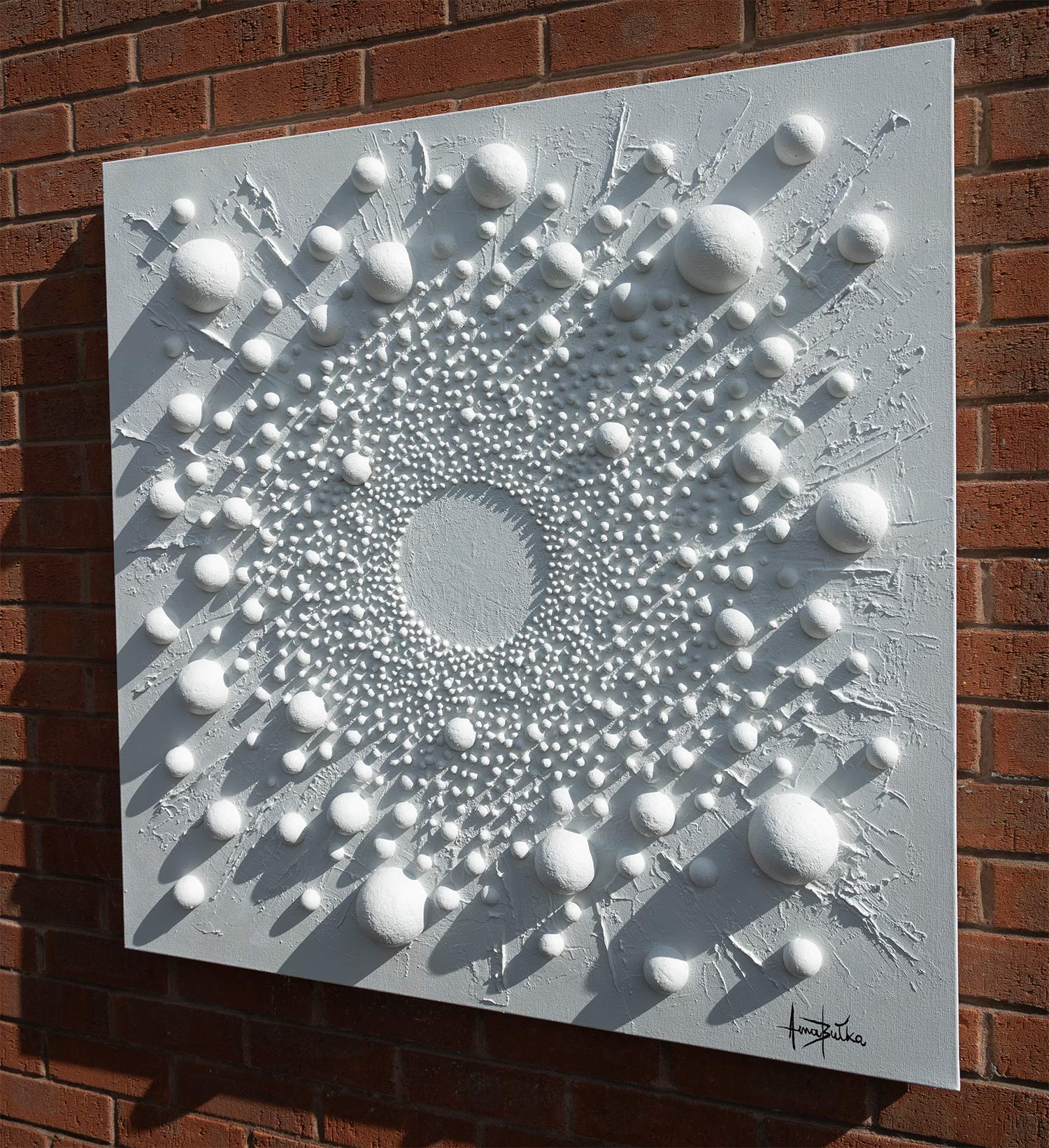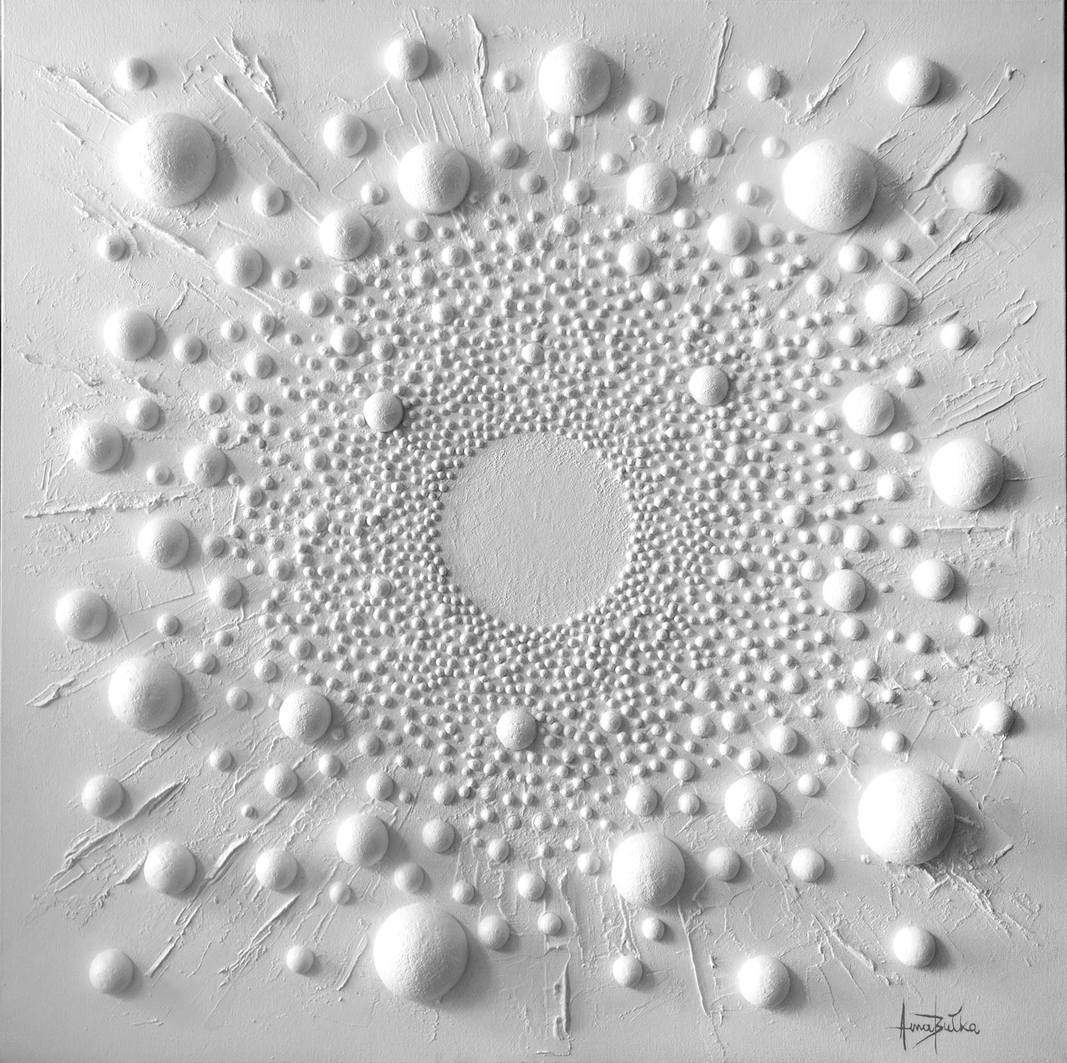 Introducing a striking, architectonic piece of wall sculpture art titled “Lunar Resonance”, created by artist Anna Marija Bulka. This large-format mixed-media artwork captures a radiant, circular abstract composition a central “moon-like” form surrounded by a burst of textured spheres, all rendered in monochrome white for a clean, minimalist aesthetic.