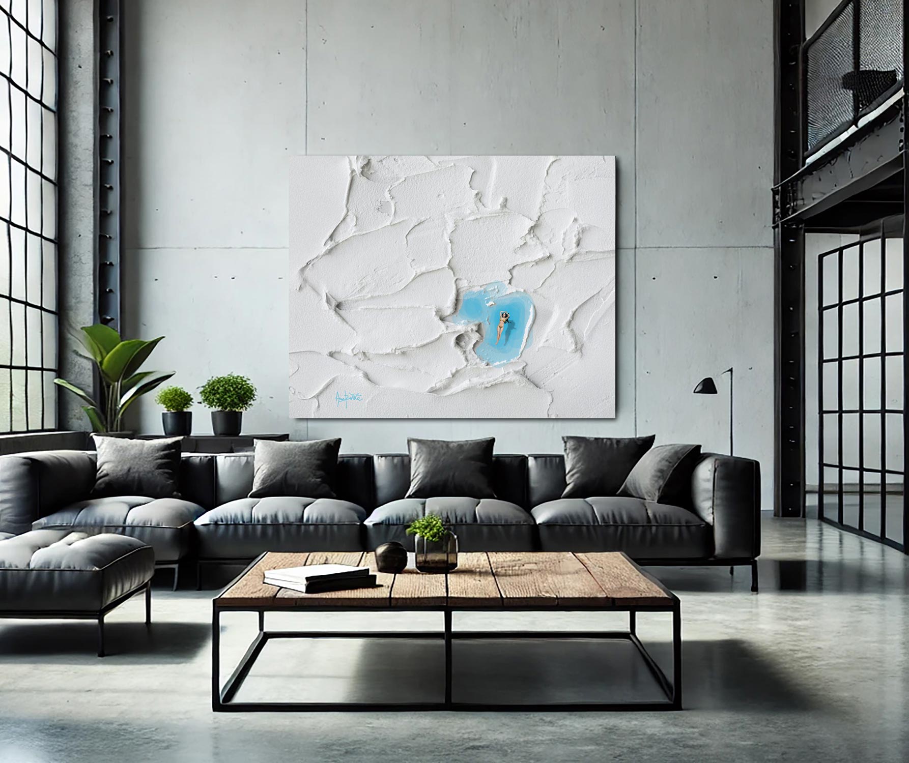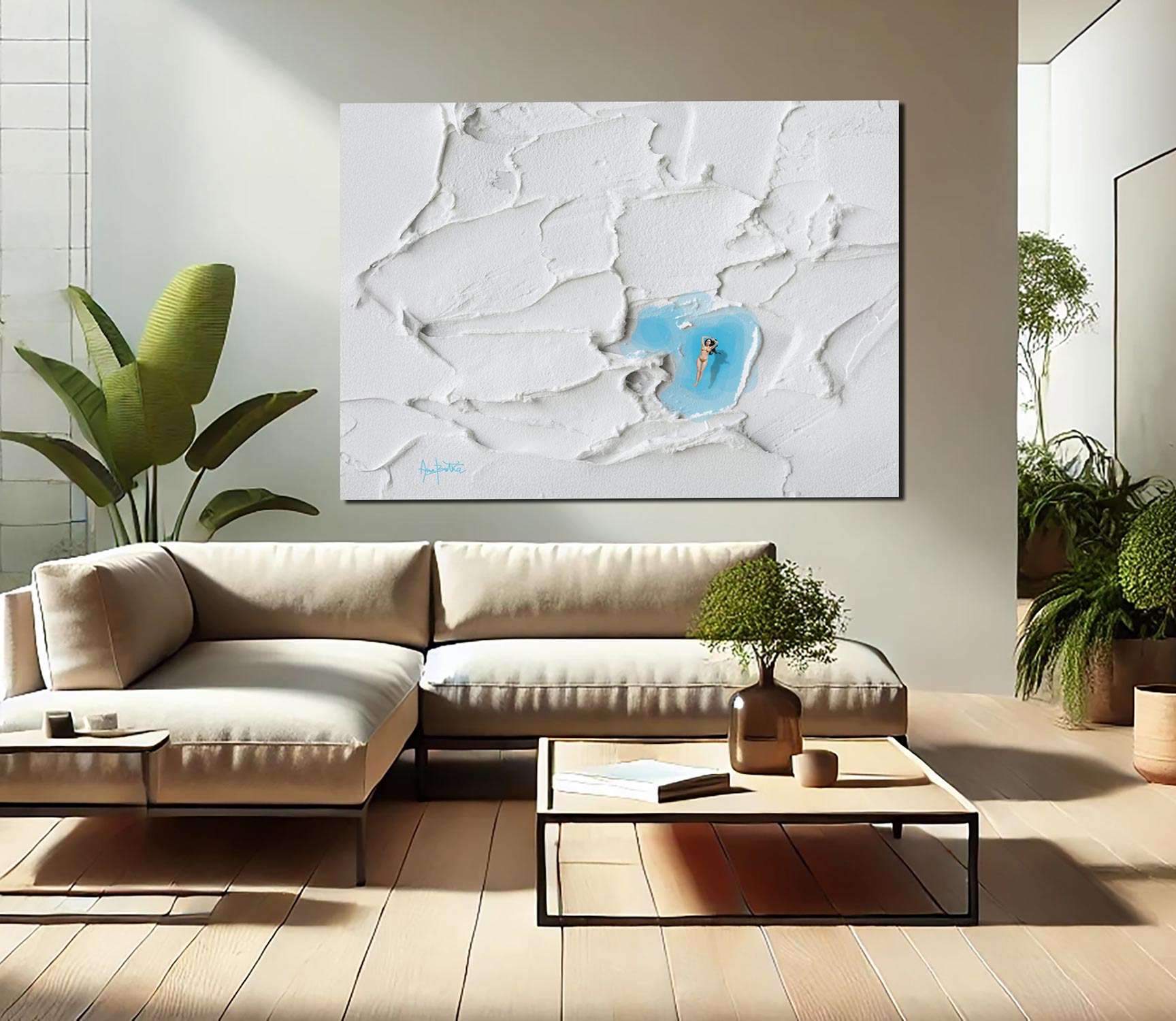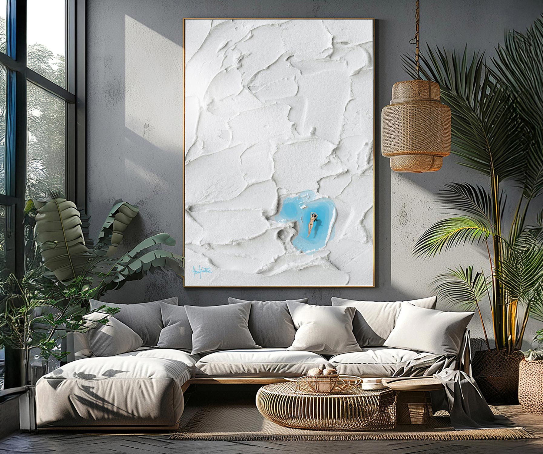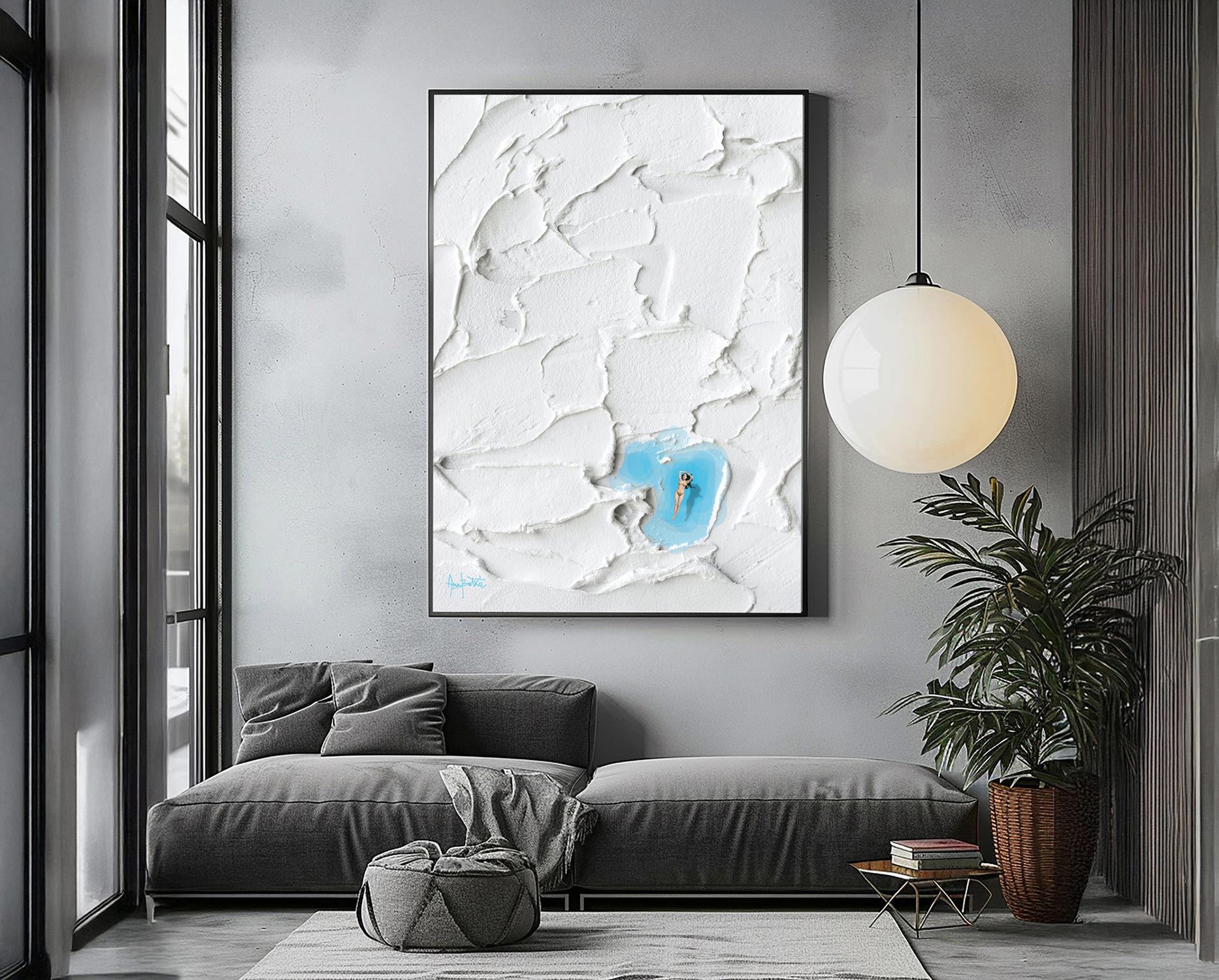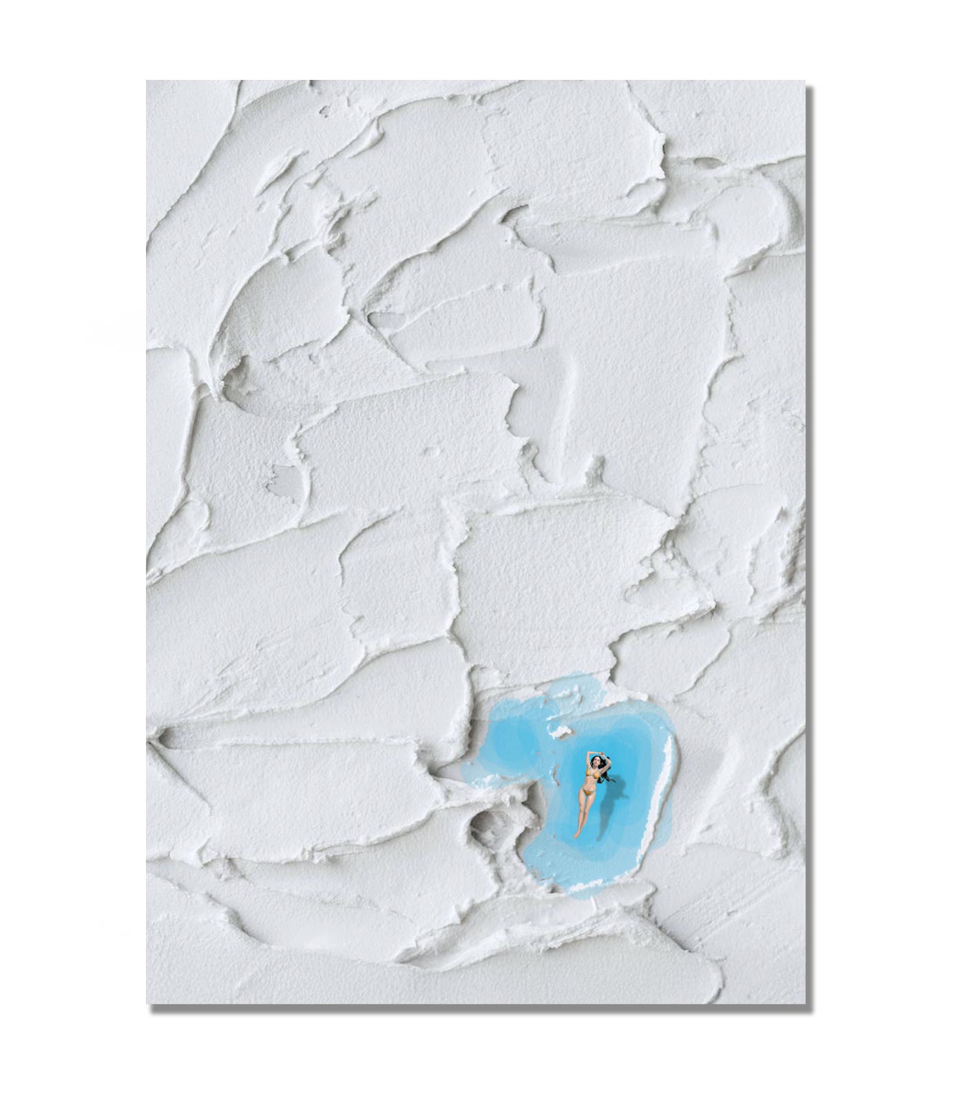 Within this textured landscape appears a small turquoise pool with a solitary swimming woman. This subtle element transforms the piece from abstract texture into a conceptual moment of calm hidden inside a rough environment.