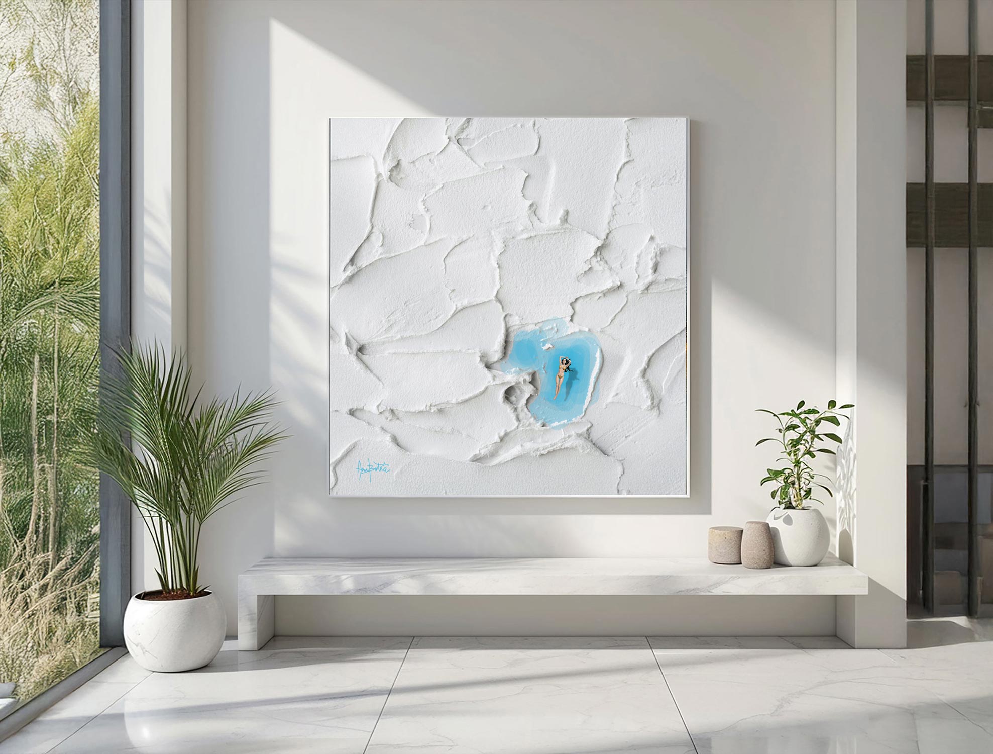 The contrast between the raw white surface and the vibrant blue water creates a striking visual focus and introduces a narrative of escape, silence and personal space.